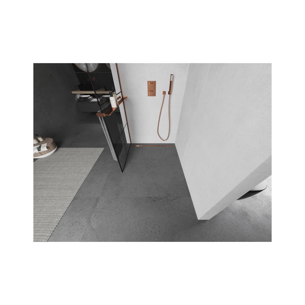 Mexen Kioto+ L, sprchová zástěna Walk-In s poličkou a věšákem 80 x 200 cm, 8mm čiré sklo černý vzor, růžové zlato profil, 800-080-123-60-77