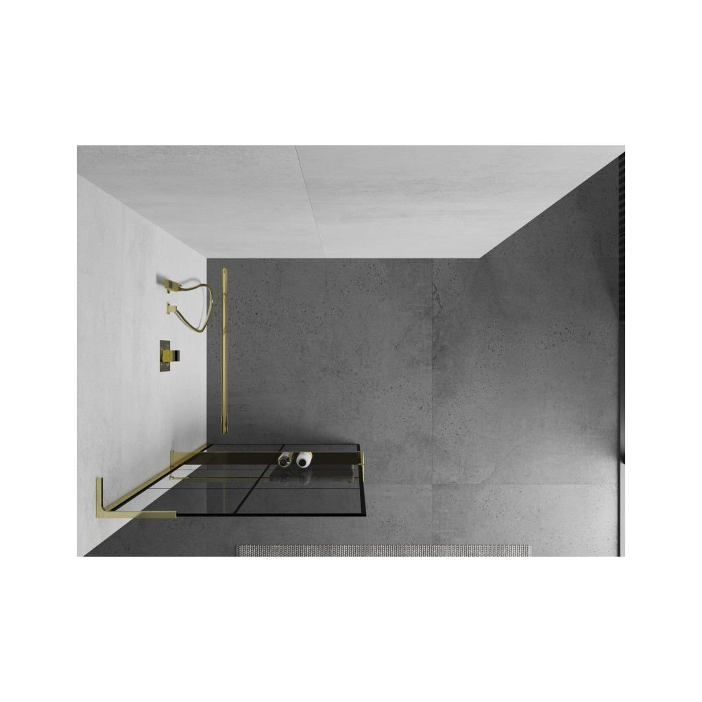 Mexen Kioto+ L, sprchová zástěna Walk-In s poličkou a věšákem 80 x 200 cm, 8mm čiré sklo černý vzor, zlatý lesklý profil, 800-080-123-50-77