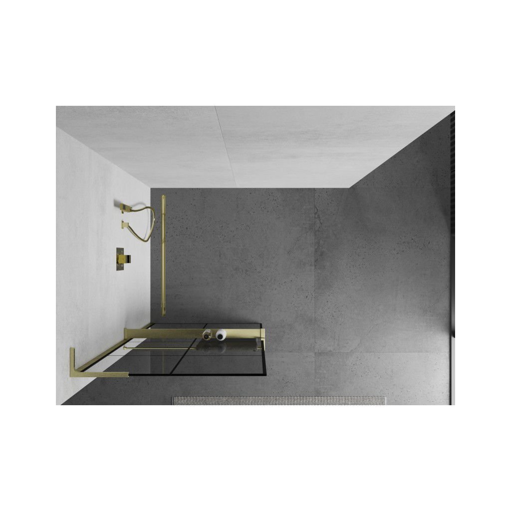 Mexen Kioto+ L, sprchová zástěna Walk-In s poličkou a věšákem 80 x 200 cm, 8mm čiré sklo černý vzor, zlatý matný profil, 800-080-123-55-77