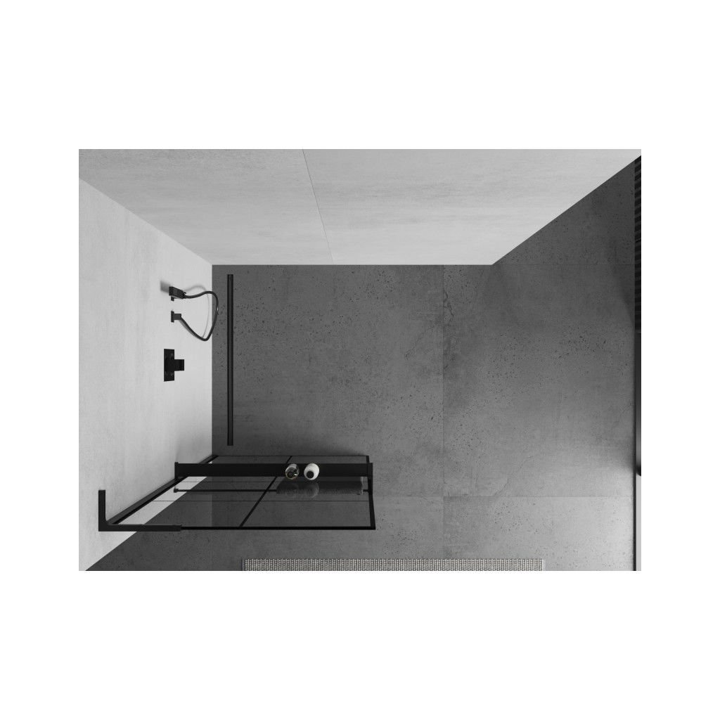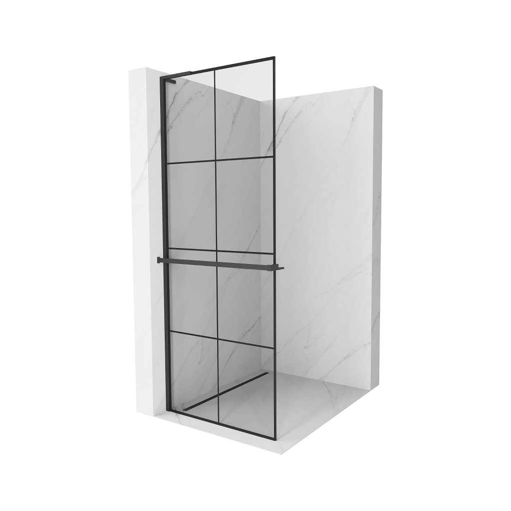 Mexen Kioto+ L, sprchová zástěna Walk-In s poličkou a věšákem 90 x 200 cm, 8mm čiré sklo černý vzor, černý profil, 800-090-123-70-77