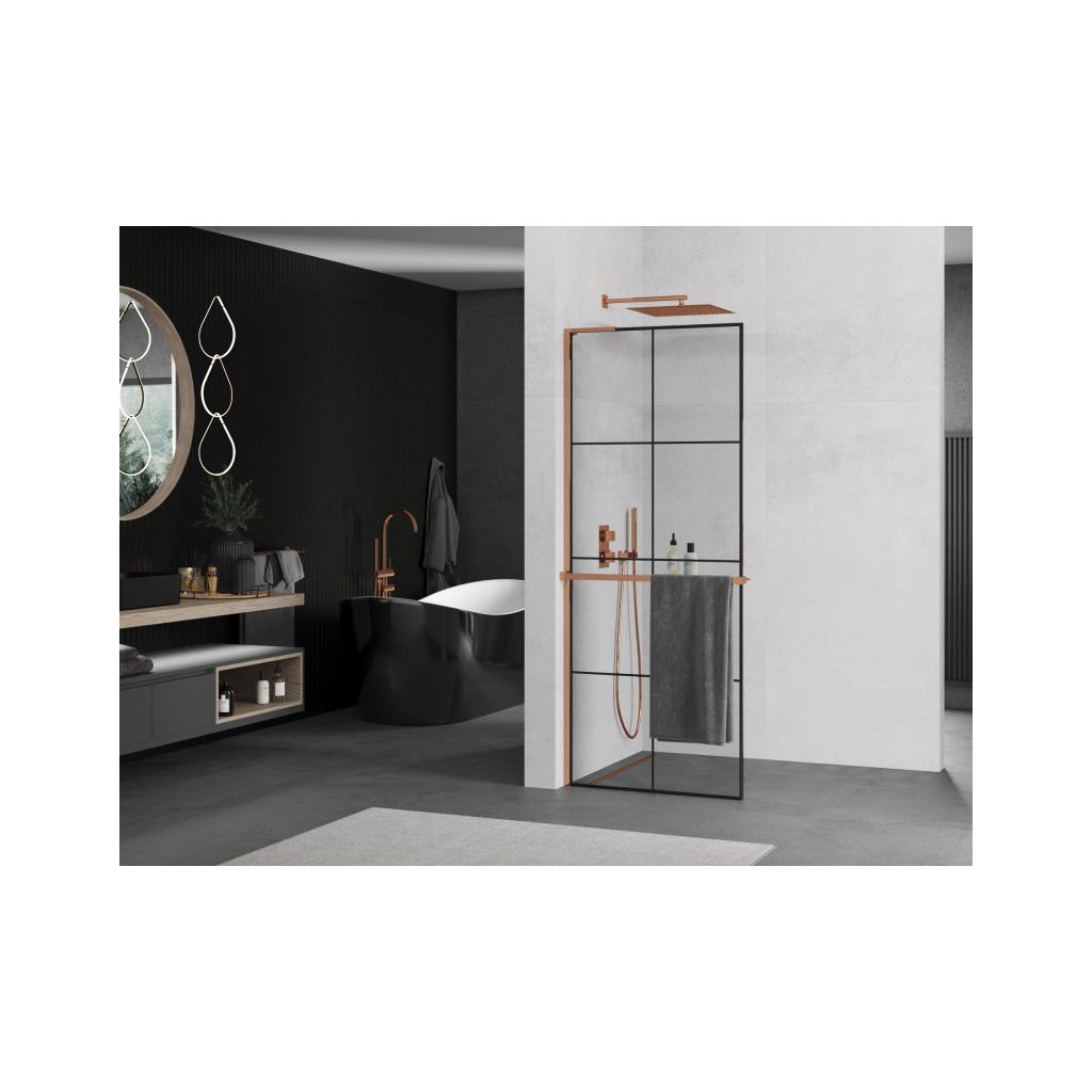 Mexen Kioto+ L, sprchová zástěna Walk-In s poličkou a věšákem 90 x 200 cm, 8mm čiré sklo černý vzor, růžové zlato profil, 800-090-123-60-77