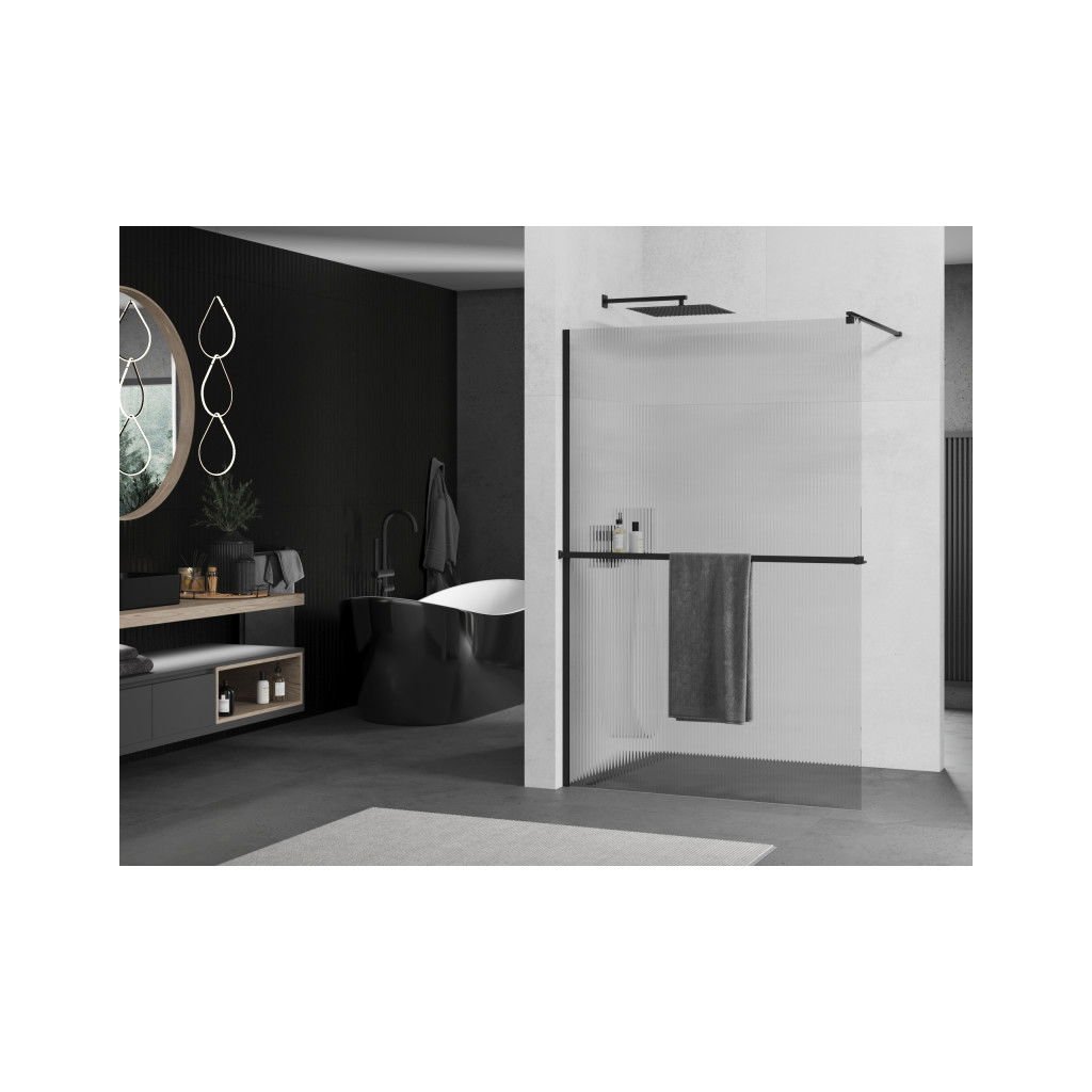 Mexen Kioto, sprchová zástěna s poličkou a ramínkem na ručníky 70 x 200 cm, 8mm sklo s žebrovým vzorem, černý profil, 800-070-121-70-09