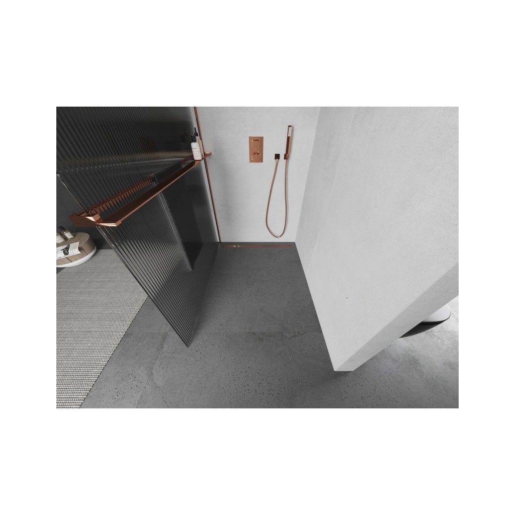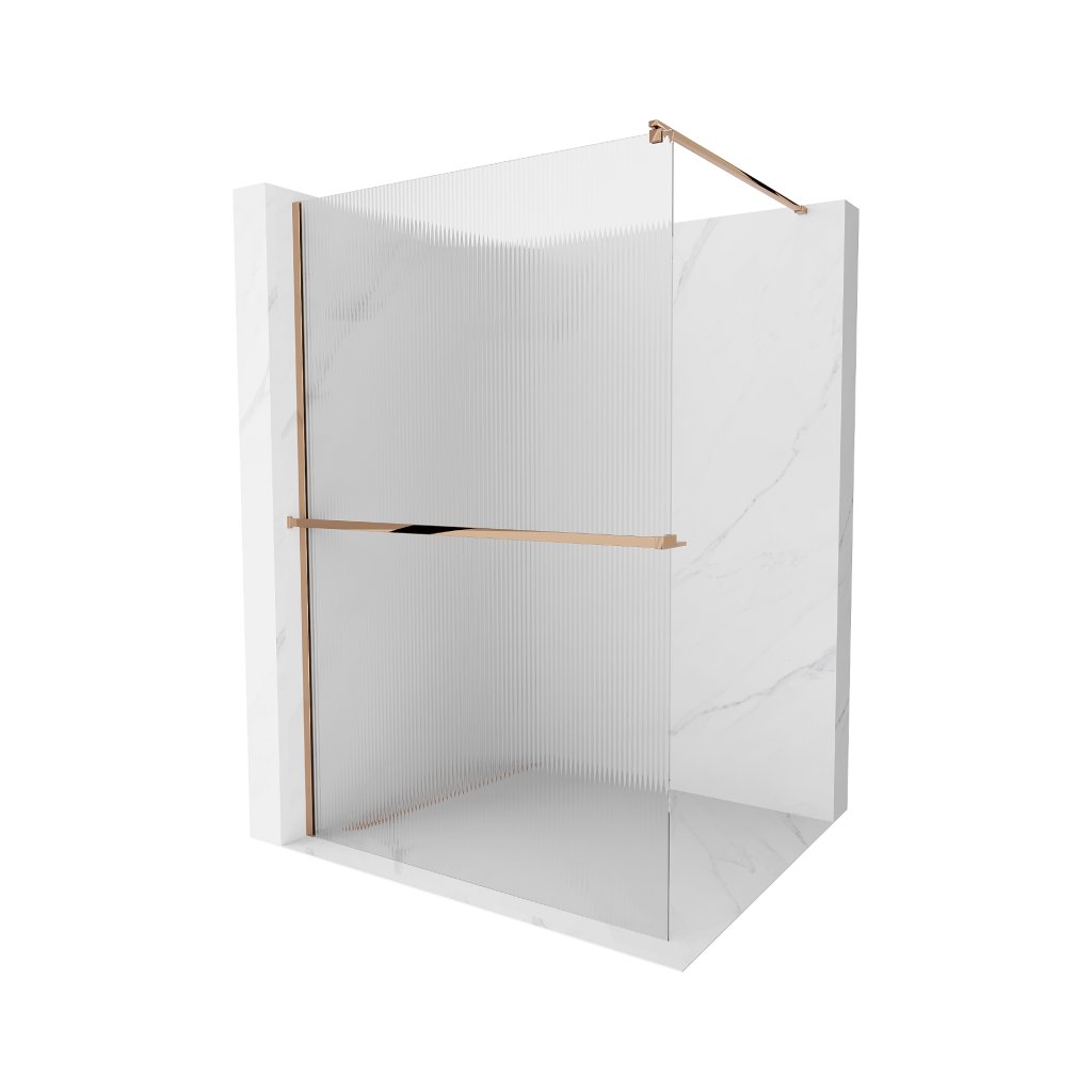Mexen Kioto, sprchová zástěna s poličkou a věšákem na ručníky 80 x 200 cm, 8mm sklo s žebrovým vzorem, růžové zlato profil, 800-080-121-60-09