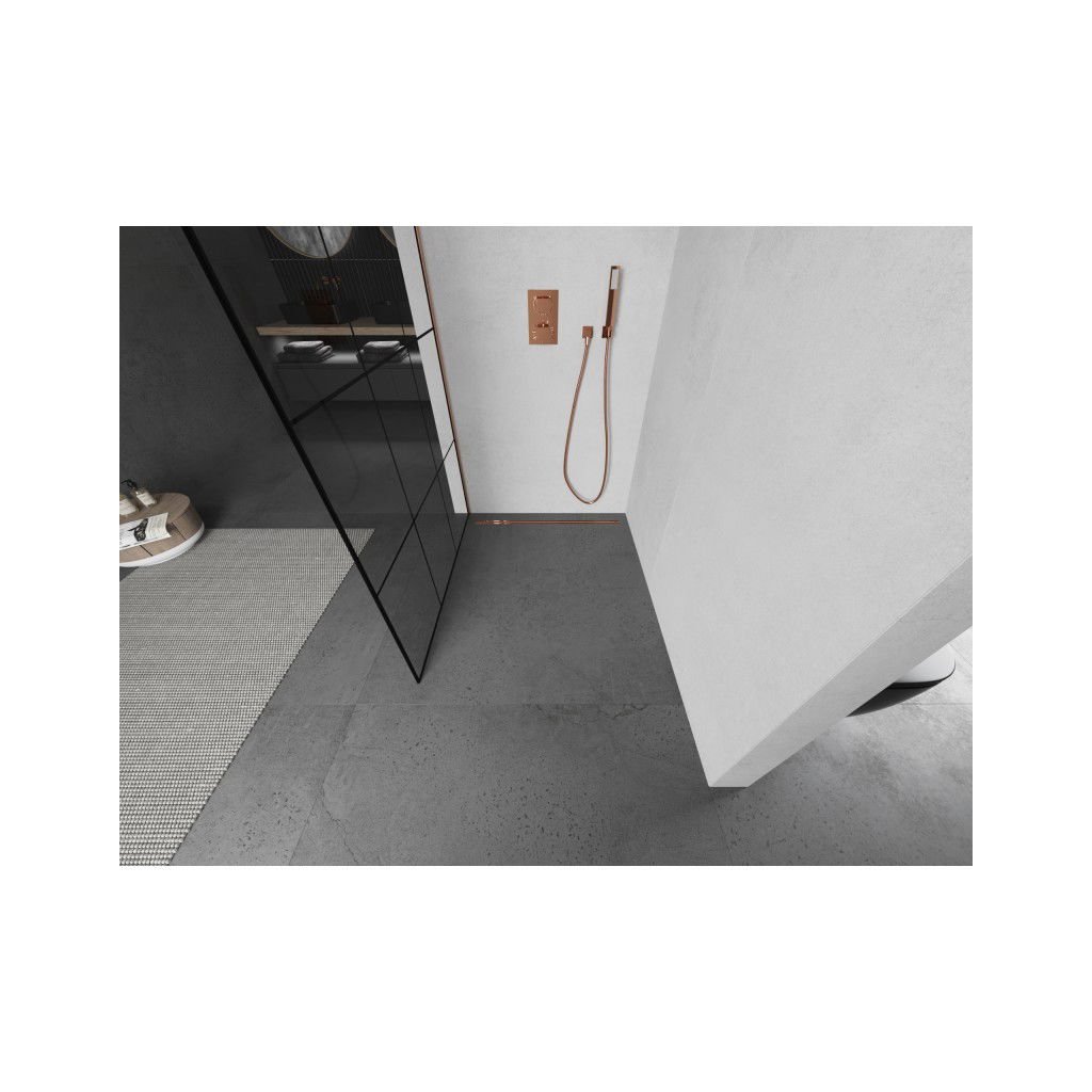 Mexen Kioto, sprchová zástěna Walk-In 110 x 200 cm, 8mm čiré sklo černý vzor, měděný matný profil, 800-110-101-65-77