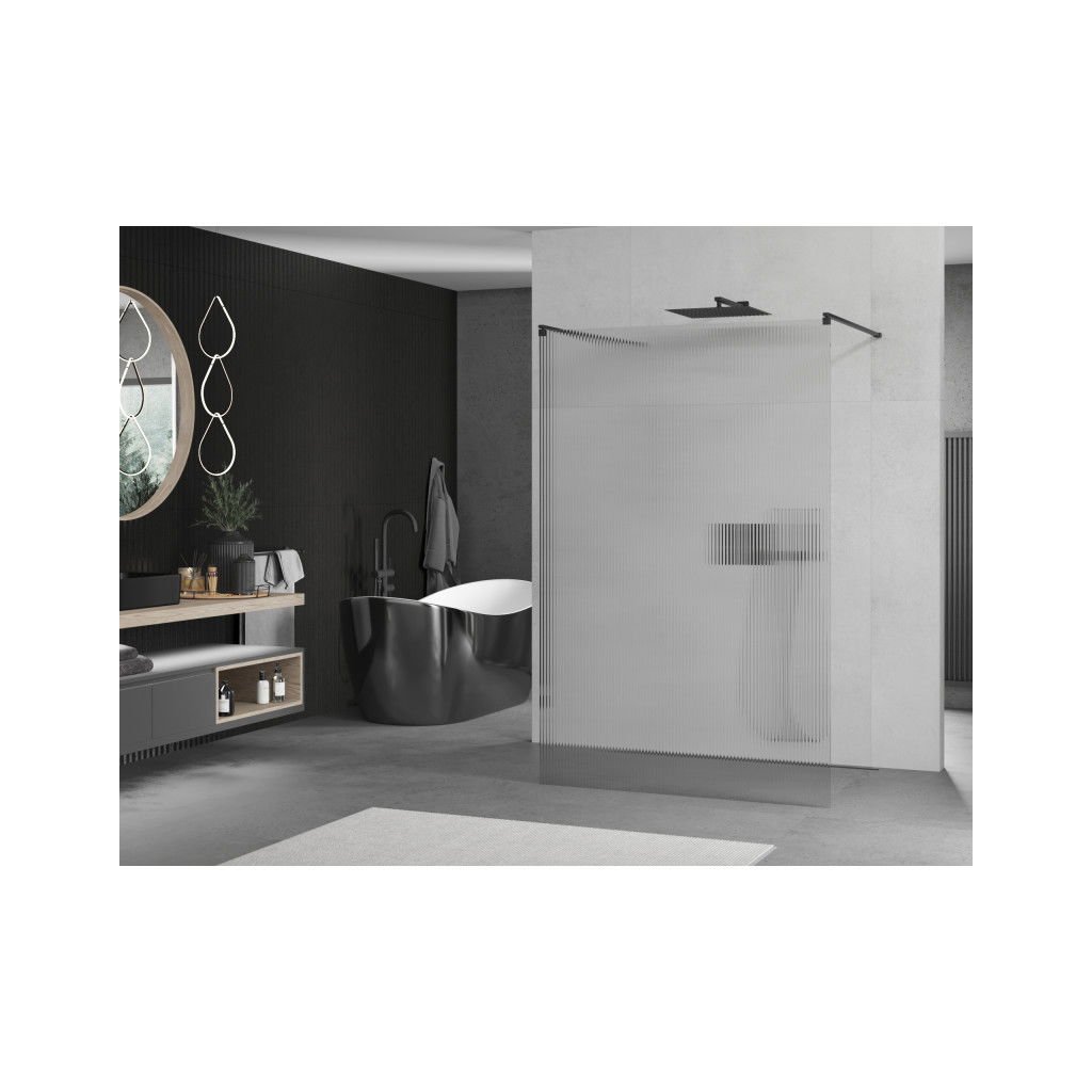 Mexen Kioto, sprchová zástěna Walk-In 130 x 200 cm, 8mm sklo s žebrovým vzorem, černý profil, 800-130-002-70-09