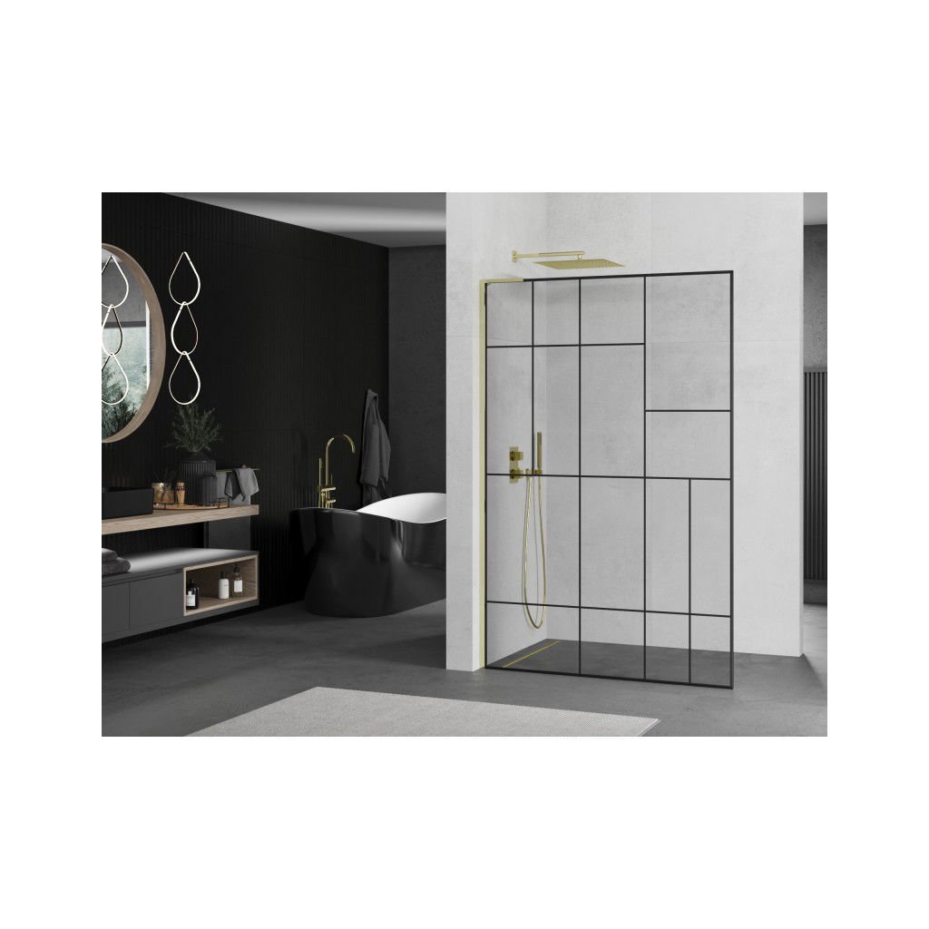 Mexen Kioto L, sprchová zástěna Walk-In 120 x 200 cm, 8mm čiré sklo černý vzor, zlatý lesklý profil, 800-120-103-50-78