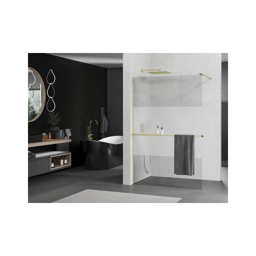 Mexen Kioto+, sprchová zástěna s poličkou a držákem na ručníky 100 x 200 cm, 8mm čiré sklo vzor námraza, zlatý profil, 800-100-121-50-35