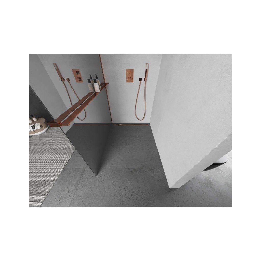 Sprchová zástěna z kolekce Walk-In je univerzálním a oblíbeným řešením pro každou koupelnu. Zástěna je bez dveří a obsahuje tyč, která lze použít k zavěšení závěsu. Zástěna Kioto série je vyrobena z 8mm tvrzeného bezpečnostního skla o výšce 200cm. Instalace je univerzální na sprchovou vaničku nebo dlažbu, vpravo nebo vlevo. Pomocí T-konektoru (není součástí balení) je možné spojení stabilizačních rozpěr a vytvoření otevřeného sprchového koutu v libovolné velikosti (sprchové zástěny Kyoto jsou dostupné v délkách 30-160 cm). Jako minimální šířku vstupu v takovém případě doporučujeme ponechat alespoň 50 cm. Nabízená sprchová zástěna obsahuje designovou kovovou poličku pro zavěšení ručníků zvenčí a umístění sprchového programu uvnitř pro pohodlnou sprchu.