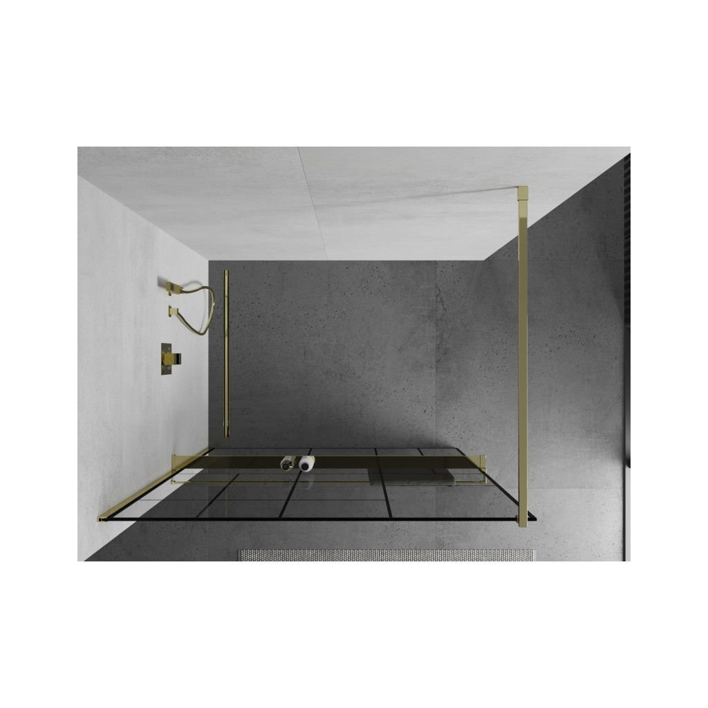 Mexen Kioto+, sprchová zástěna s poličkou a držákem na ručníky 110 x 200 cm, 8mm čiré sklo vzor černý, zlatý profil, 800-110-121-50-78