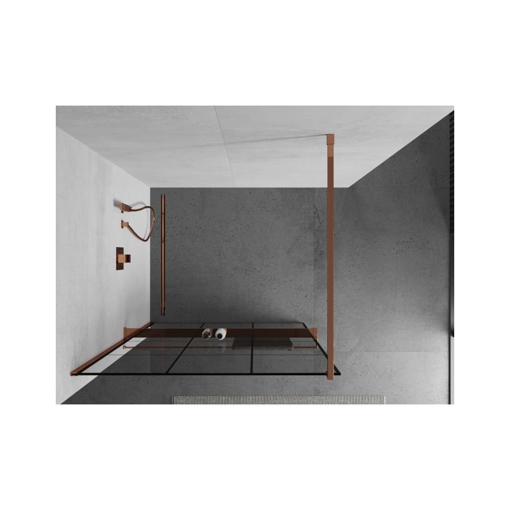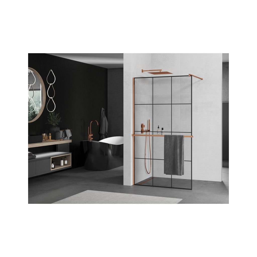 Mexen Kioto+, sprchová zástěna s poličkou a držákem na ručníky 120 x 200 cm, 8mm čiré sklo vzor černý, profil růžové zlato, 800-120-121-60-77