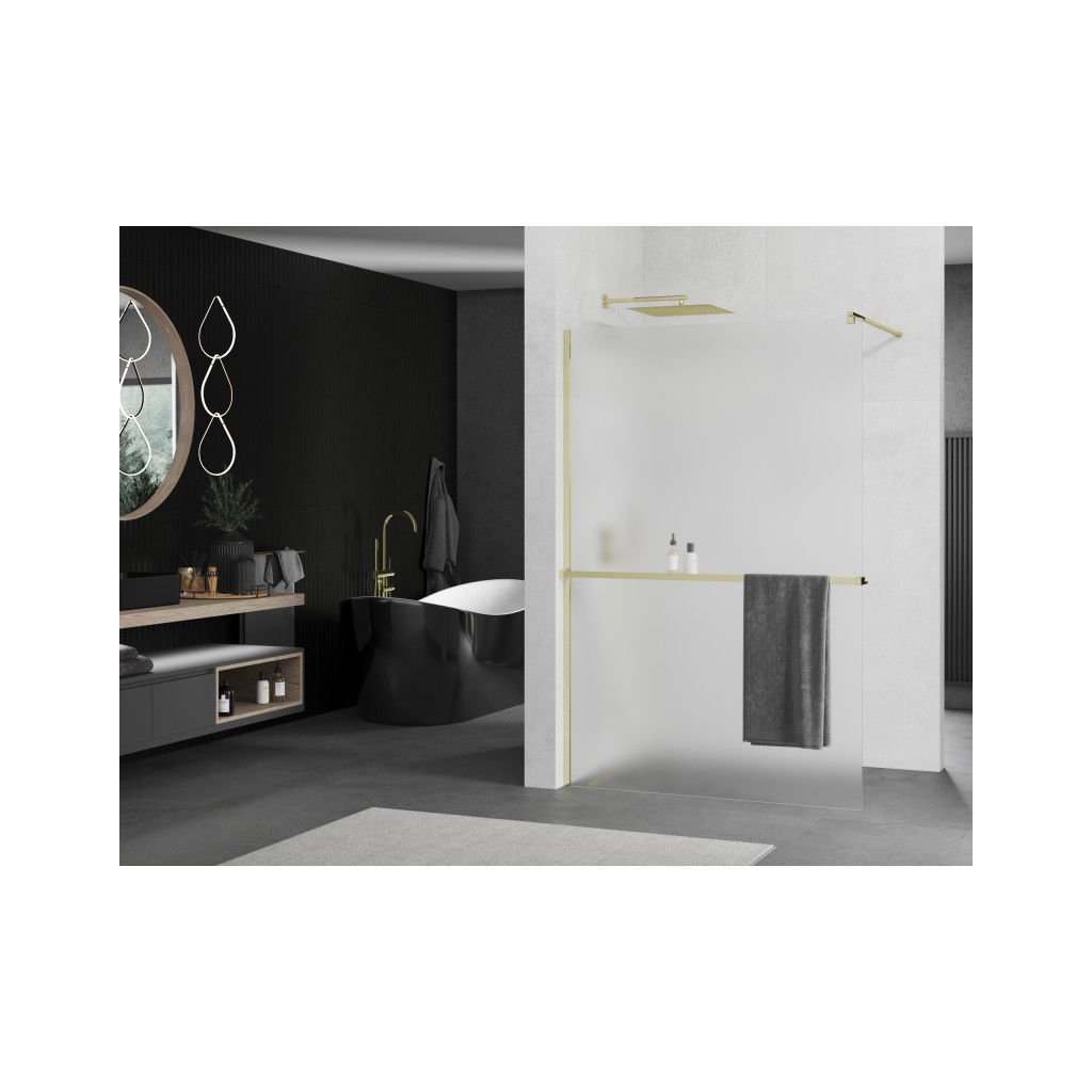 Mexen Kioto+, sprchová zástěna s poličkou a držákem na ručníky 120 x 200 cm, 8mm námraza sklo, zlatý profil, 800-120-121-50-30
