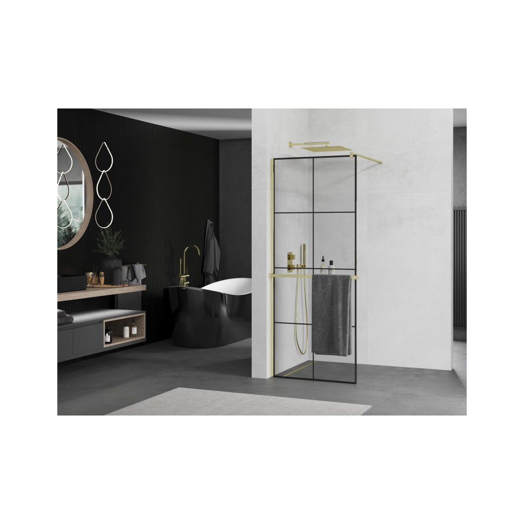 Mexen Kioto+, sprchová zástěna s poličkou a držákem na ručníky 90 x 200 cm, 8mm čiré sklo vzor černý, zlatý profil, 800-090-121-50-77