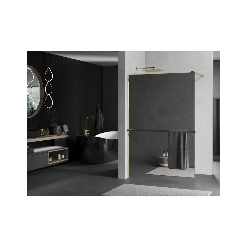 Sprchová zástěna z kolekce Walk-In je univerzálním a oblíbeným řešením pro každou koupelnu. Zástěna je bez dveří a obsahuje tyč, která lze použít k zavěšení závěsu. Zástěna Kioto série je vyrobena z 8mm tvrzeného bezpečnostního skla o výšce 200cm. Instalace je univerzální na sprchovou vaničku nebo dlažbu, vpravo nebo vlevo. Pomocí T-konektoru (není součástí balení) je možné spojení stabilizačních rozpěr a vytvoření otevřeného sprchového koutu v libovolné velikosti (sprchové zástěny Kyoto jsou dostupné v délkách 30-160 cm). Jako minimální šířku vstupu v takovém případě doporučujeme ponechat alespoň 50 cm. Nabízená sprchová zástěna obsahuje designovou kovovou poličku pro zavěšení ručníků zvenčí a umístění sprchového programu uvnitř pro pohodlnou sprchu.