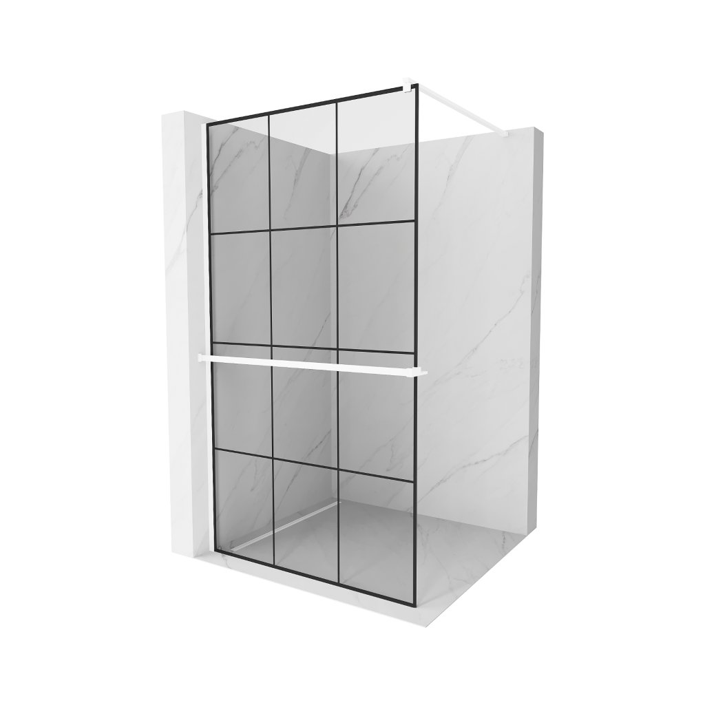 Mexen Kioto+, sprchová zástěna Walk-In s poličkou a věšákem 100 x 200 cm, 8mm čiré sklo černý vzor, bílý profil, 800-100-121-20-77