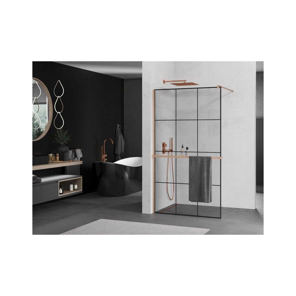 Mexen Kioto+, sprchová zástěna Walk-In s poličkou a věšákem 110 x 200 cm, 8mm čiré sklo černý vzor, měděný matný profil, 800-110-121-65-77