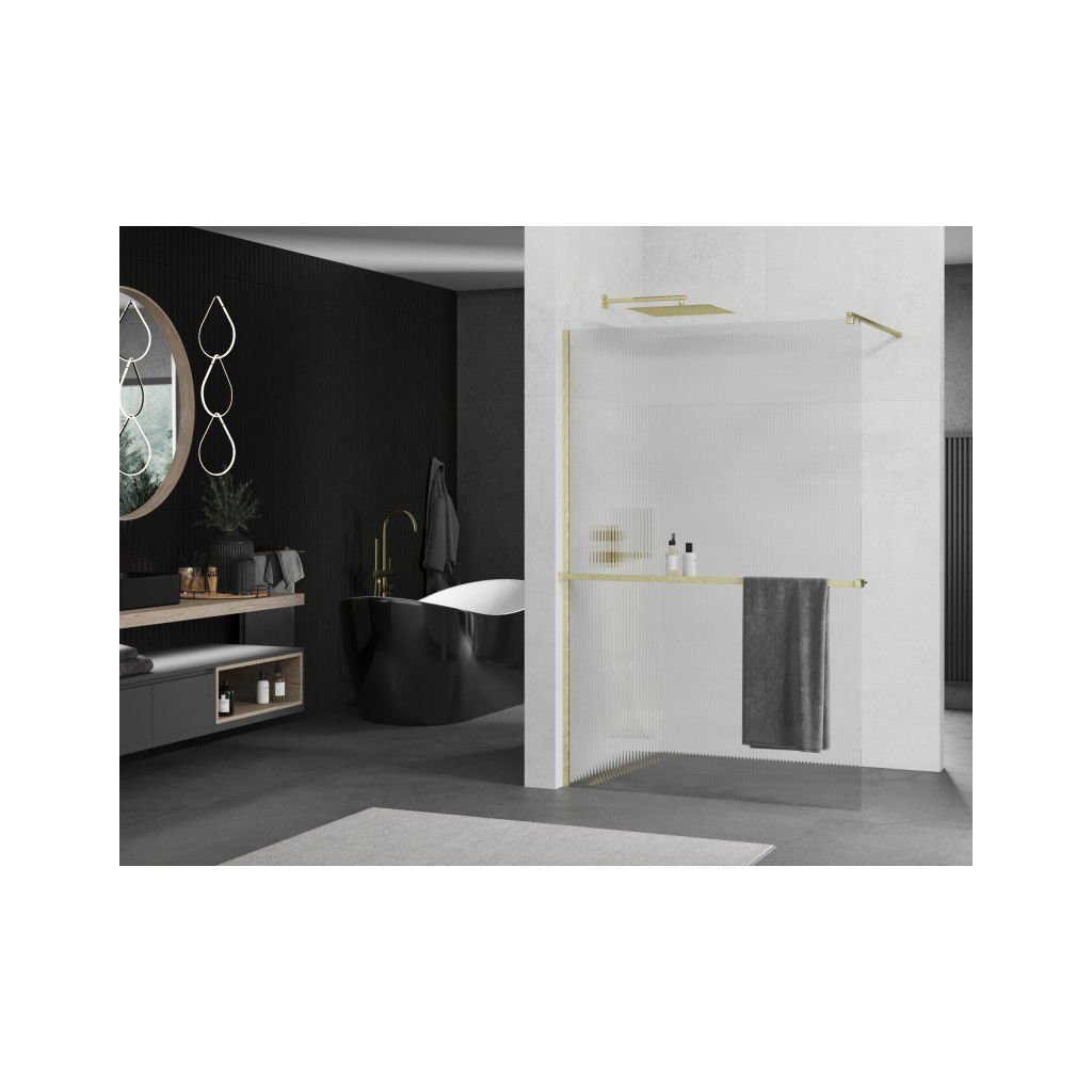 Mexen Kioto+, sprchová zástěna Walk-In s poličkou a věšákem 120 x 200 cm, 8mm sklo s žebrovým vzorem, zlatý matný profil, 800-120-121-55-09
