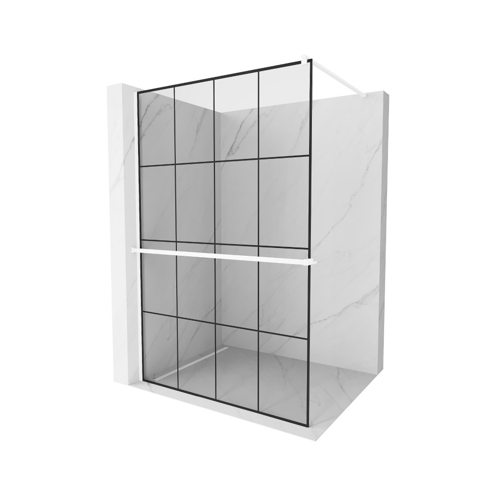 Mexen Kioto+, sprchová zástěna Walk-In s poličkou a věšákem 130 x 200 cm, 8mm čiré sklo černý vzor, bílý profil, 800-130-121-20-77