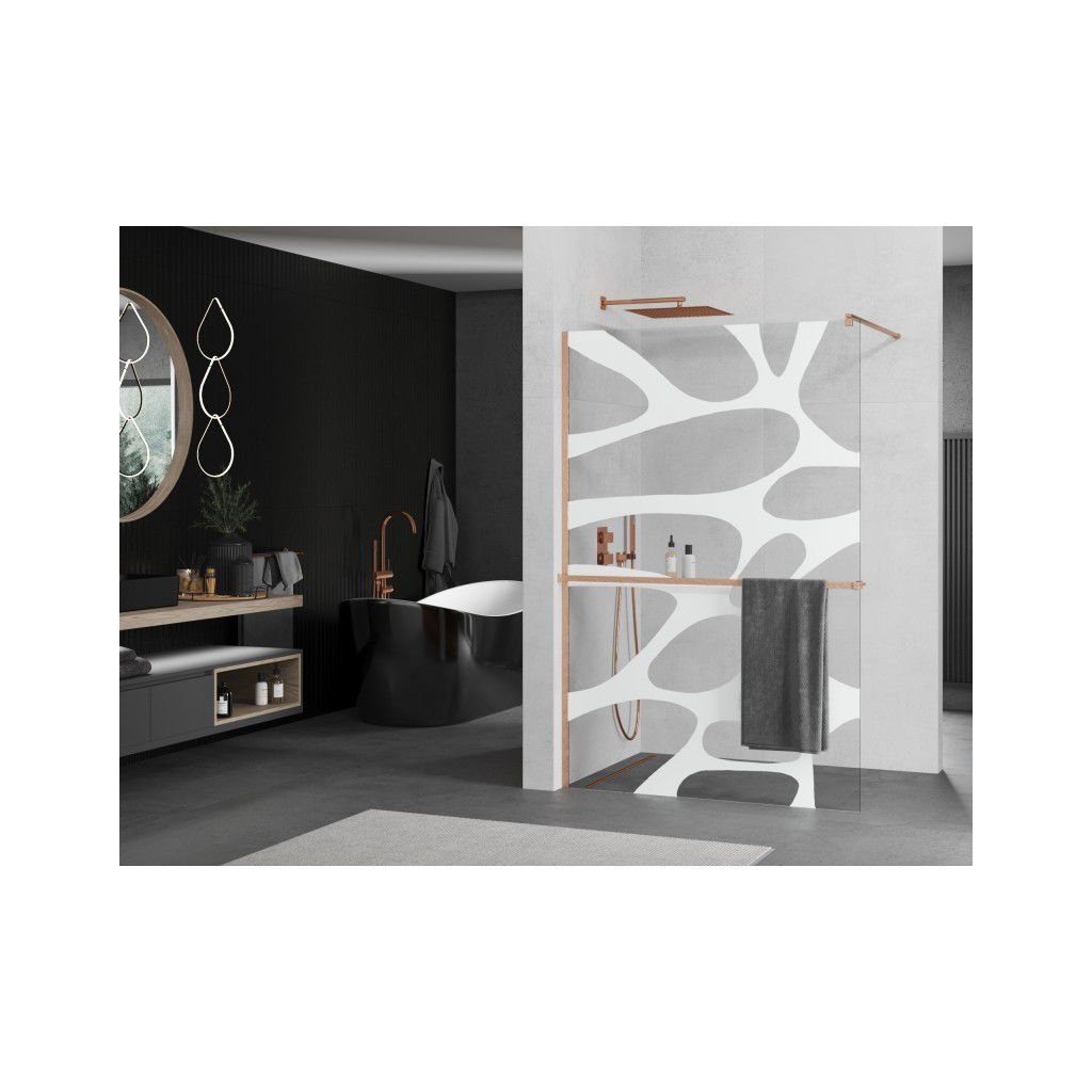 Mexen Kioto+, sprchová zástěna Walk-In s poličkou a věšákem 140 x 200 cm, 8mm čiré sklo bílý vzor, měděný matný profil, 800-140-121-65-97