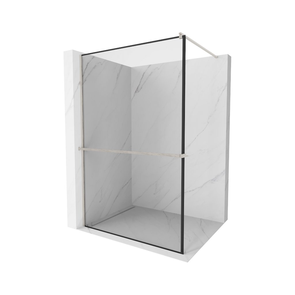 Mexen Kioto+, sprchová zástěna Walk-In s poličkou a věšákem 140 x 200 cm, 8mm čiré sklo černý vzor, broušená ocel profil, 800-140-121-97-70