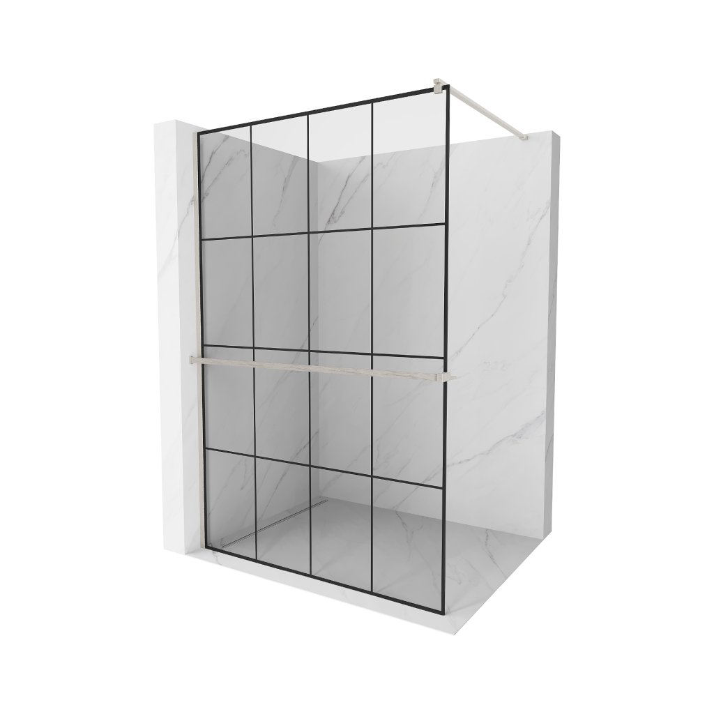 Mexen Kioto+, sprchová zástěna Walk-In s poličkou a věšákem 140 x 200 cm, 8mm čiré sklo černý vzor, broušená ocel profil, 800-140-121-97-77