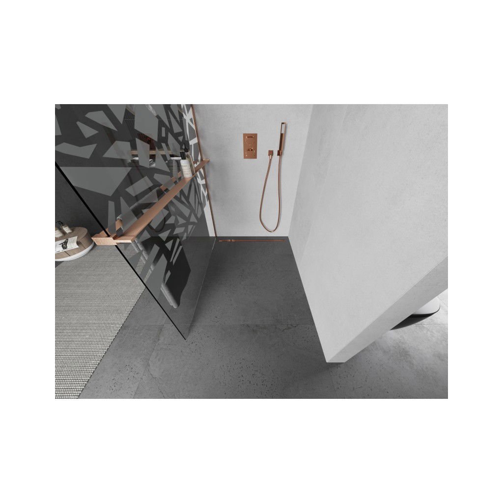 Mexen Kioto+, sprchová zástěna Walk-In s poličkou a věšákem 70 x 200 cm, 8mm čiré sklo bílý vzor, měděný matný profil, 800-070-121-65-85