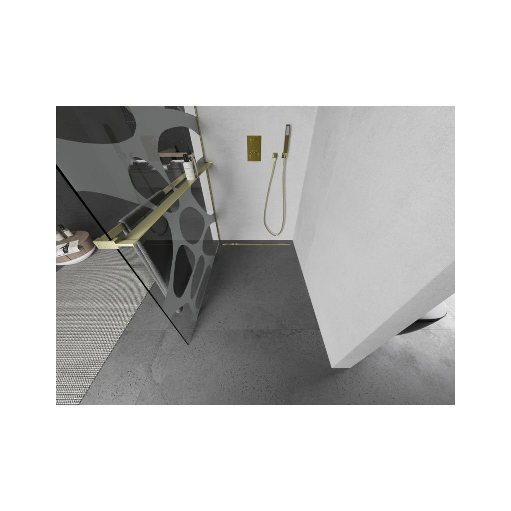 Mexen Kioto+, sprchová zástěna Walk-In s poličkou a věšákem 70 x 200 cm, 8mm čiré sklo bílý vzor, zlatý matný profil, 800-070-121-55-97