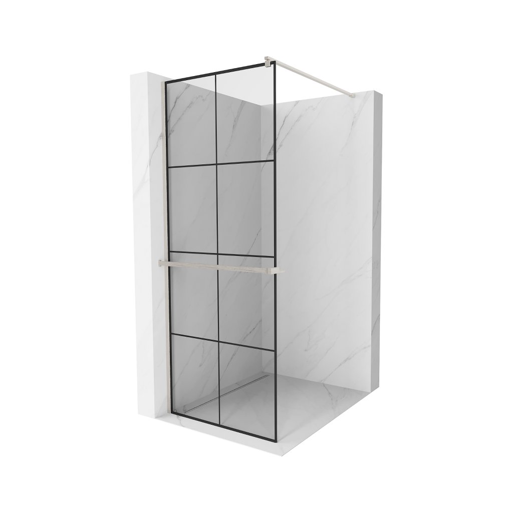 Mexen Kioto+, sprchová zástěna Walk-In s poličkou a věšákem 80 x 200 cm, 8mm čiré sklo černý vzor, broušená ocel profil, 800-080-121-97-77