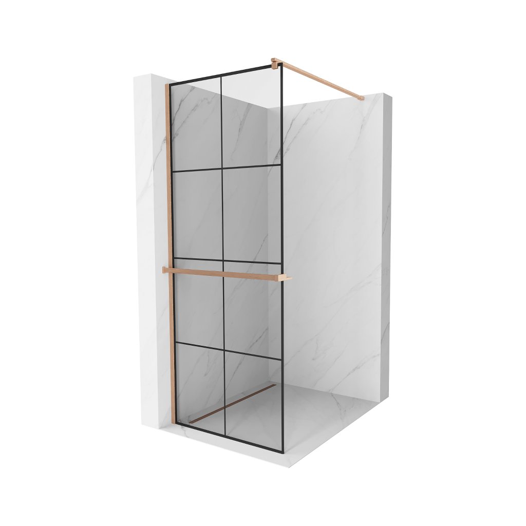 Mexen Kioto+, sprchová zástěna Walk-In s poličkou a věšákem 80 x 200 cm, 8mm čiré sklo černý vzor, měděný matný profil, 800-080-121-65-77
