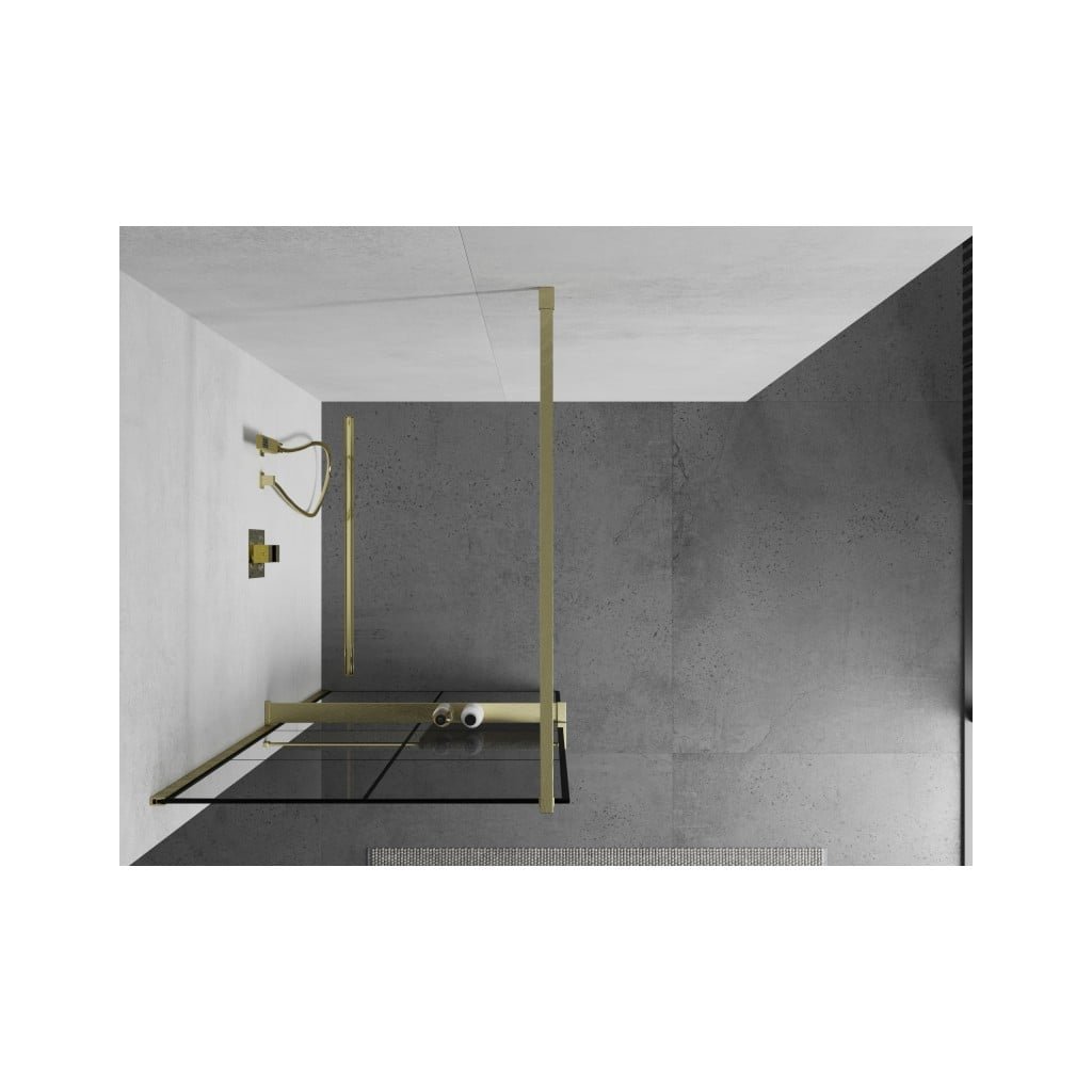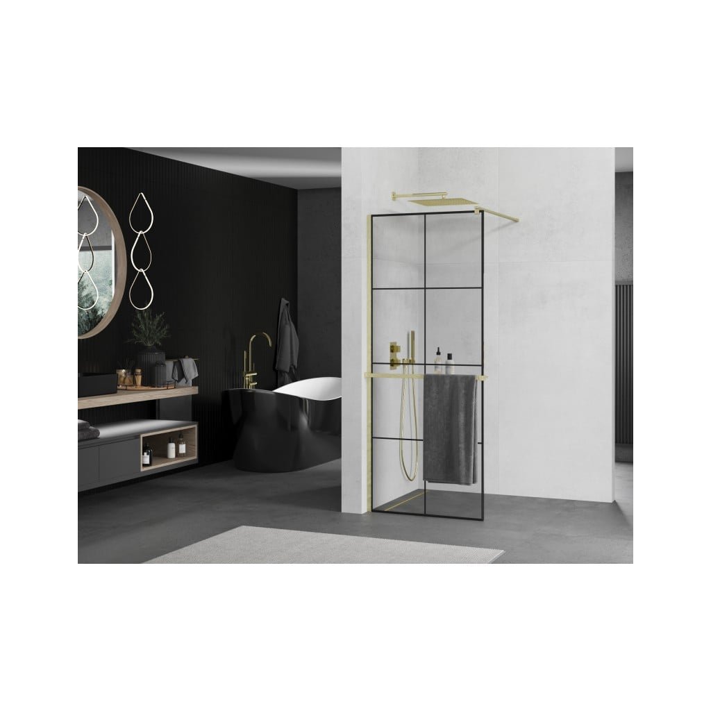 Mexen Kioto+, sprchová zástěna Walk-In s poličkou a věšákem 80 x 200 cm, 8mm čiré sklo černý vzor, zlatý matný profil, 800-080-121-55-77