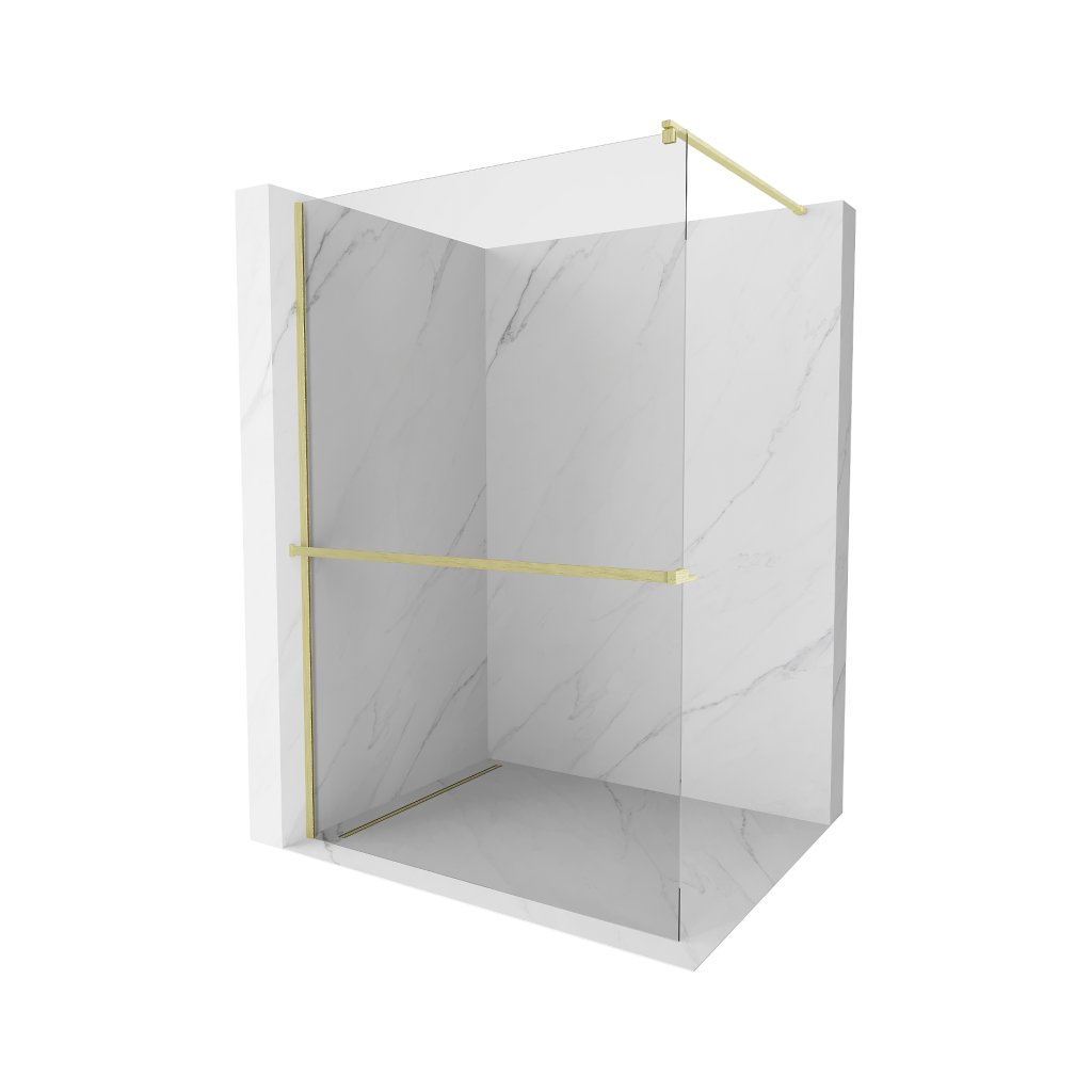 Mexen Kioto+, sprchová zástěna Walk-In s poličkou a věšákem 85 x 200 cm, 8mm čiré sklo, zlatý matný profil, 800-085-121-55-00