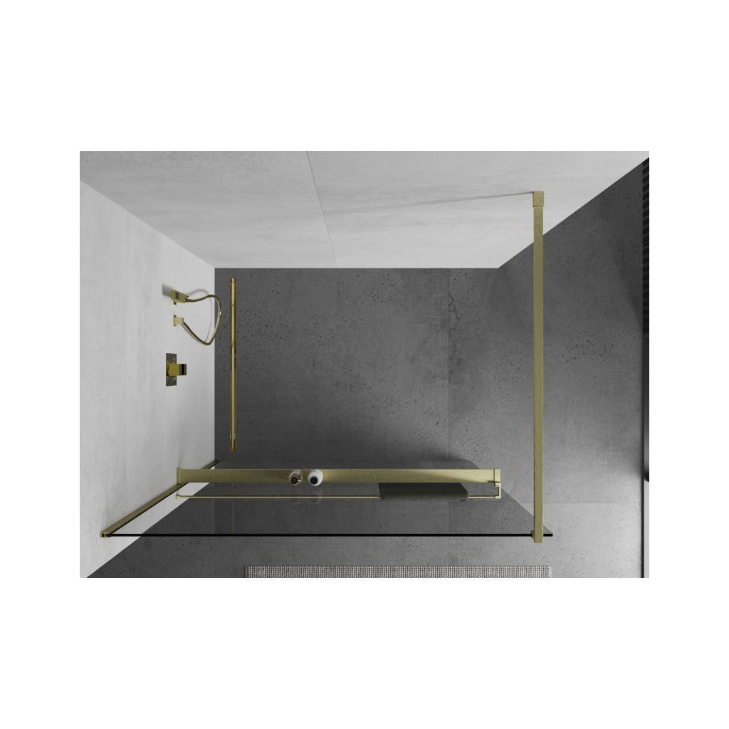 Mexen Kioto+, sprchová zástěna Walk-In s poličkou a věšákem 90 x 200 cm, 8mm čiré sklo, zlatý matný profil, 800-090-121-55-00