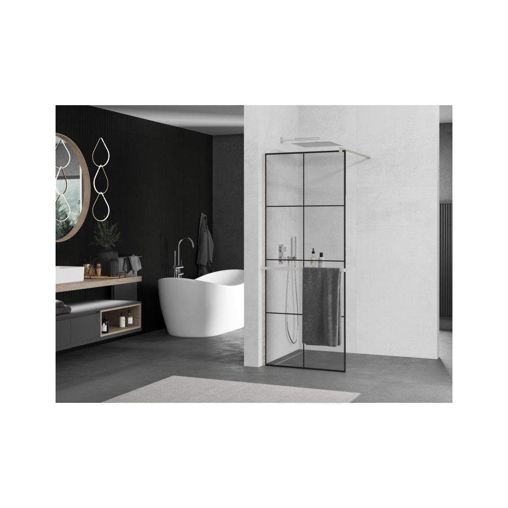 Mexen Kioto+, sprchová zástěna Walk-In s poličkou a věšákem 90 x 200 cm, 8mm čiré sklo černý vzor, broušená ocel profil, 800-090-121-97-77