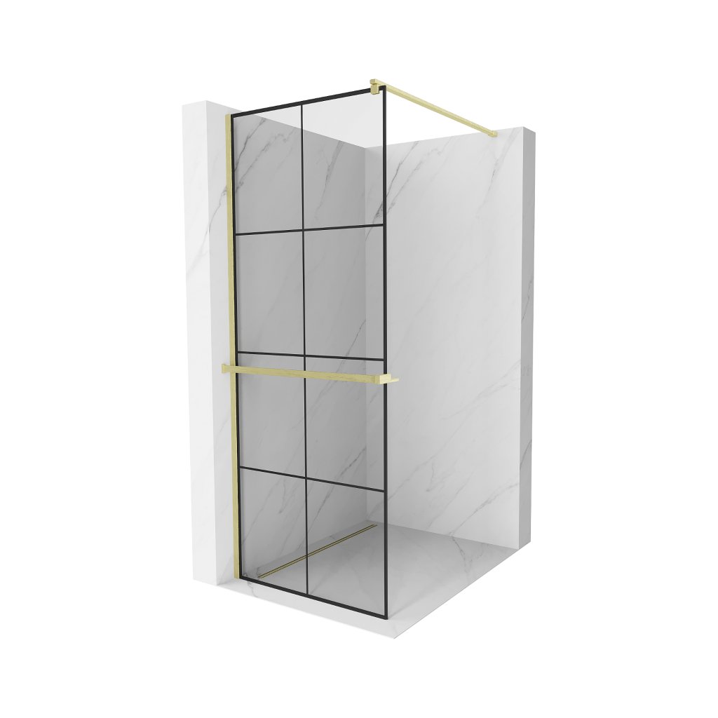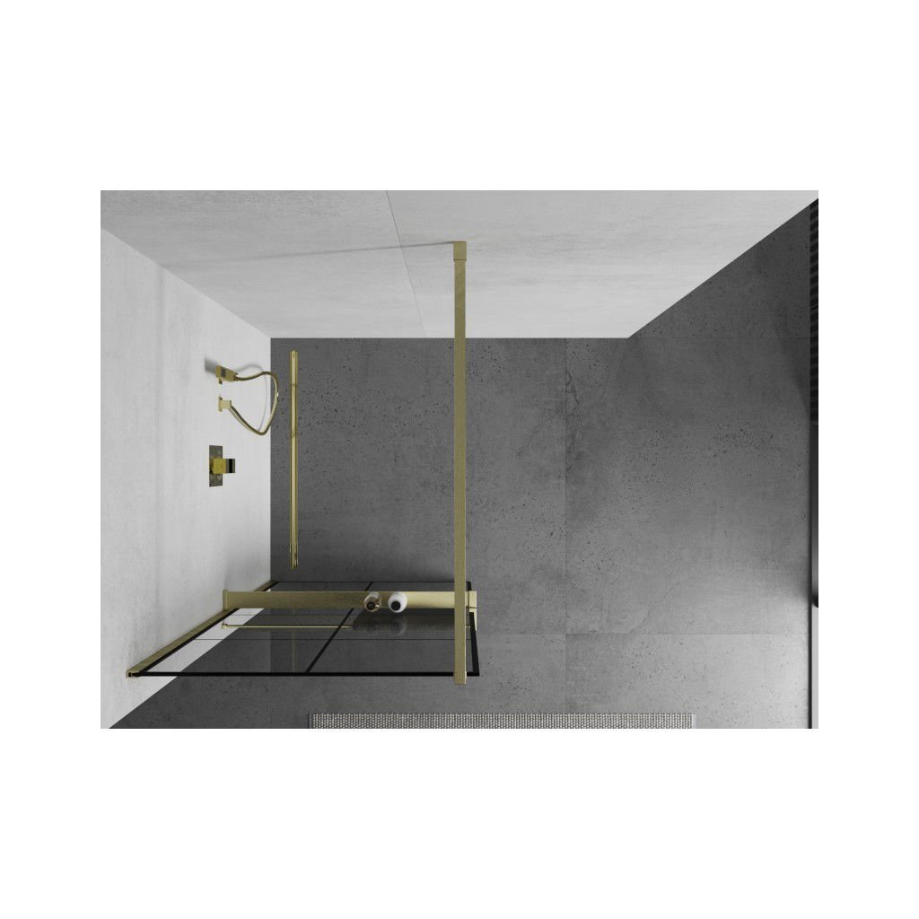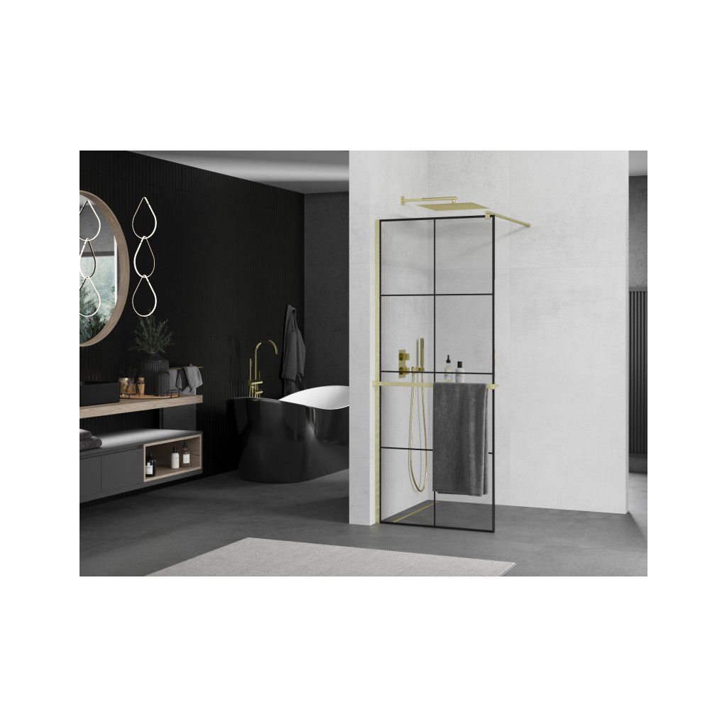 Mexen Kioto+, sprchová zástěna Walk-In s poličkou a věšákem 90 x 200 cm, 8mm čiré sklo černý vzor, zlatý matný profil, 800-090-121-55-77