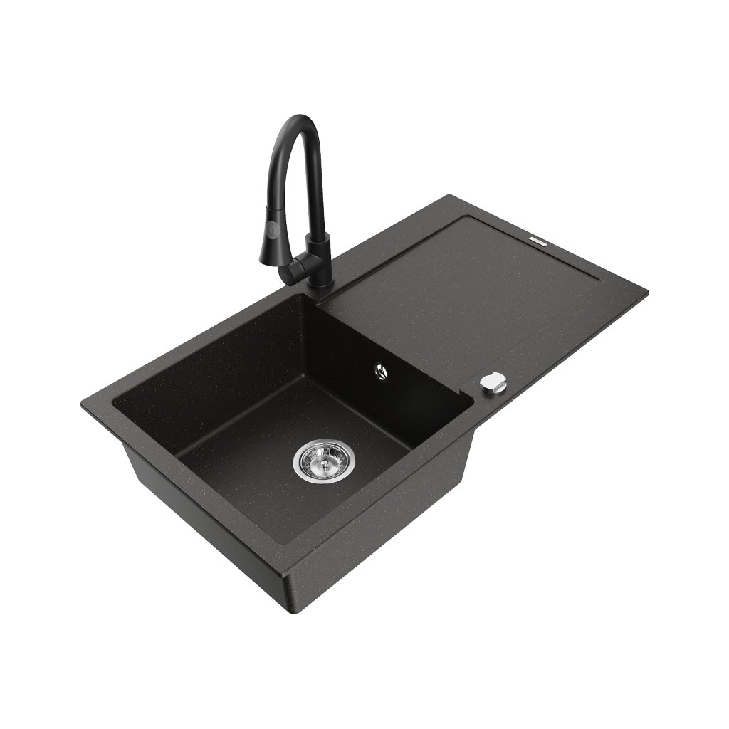 Mexen Leo, 1-komorový granitový dřez 900x500x190 mm a dřezová baterie Elia, černá-zlatá metalíza, 6501-75-670101-70