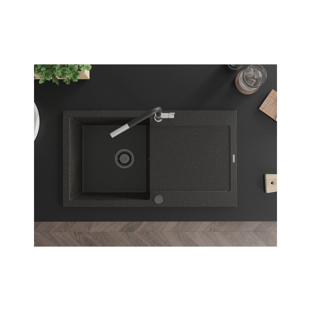 Mexen Leo, 1-komorový granitový dřez 900x500x190 mm a dřezová baterie Flora, černá-zlatá metalíza, 6501-75-670401-07-B
