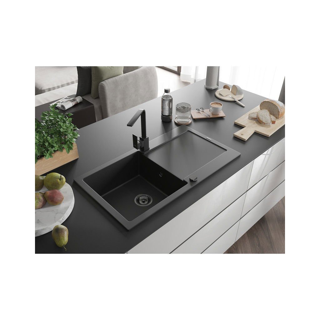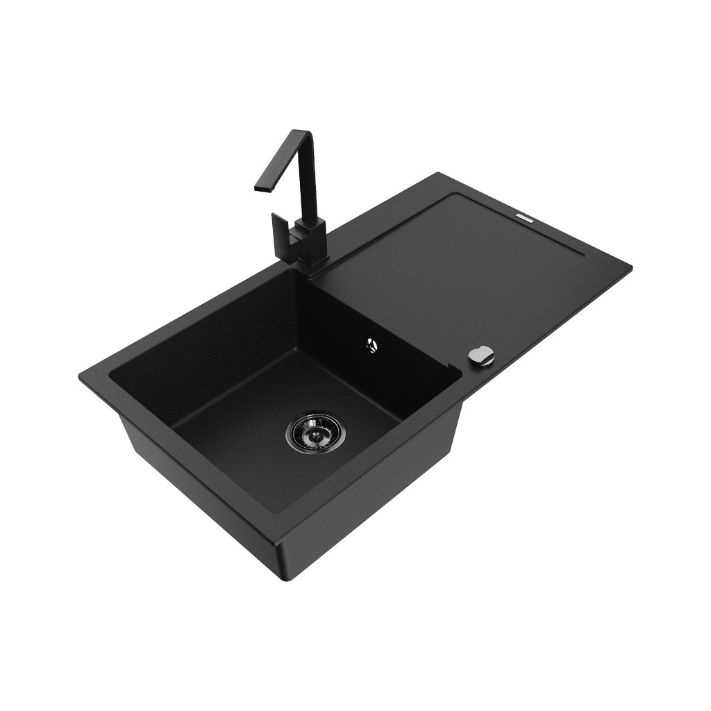 Mexen Leo, dřez granitový 900x500x190 mm, 1-komorový, černá s černým sifonem a černá dřezová baterie Rita, 6501-77-670300-70-B