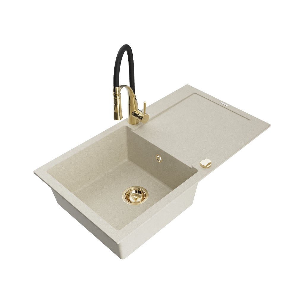 Mexen Leo, granitový dřez 900x500x190 mm, 1-komorový a dřezová baterie Aster, béžová, 6501-69-73450-57-G
