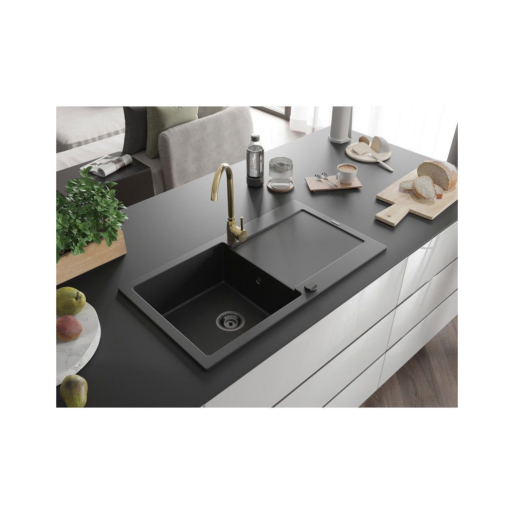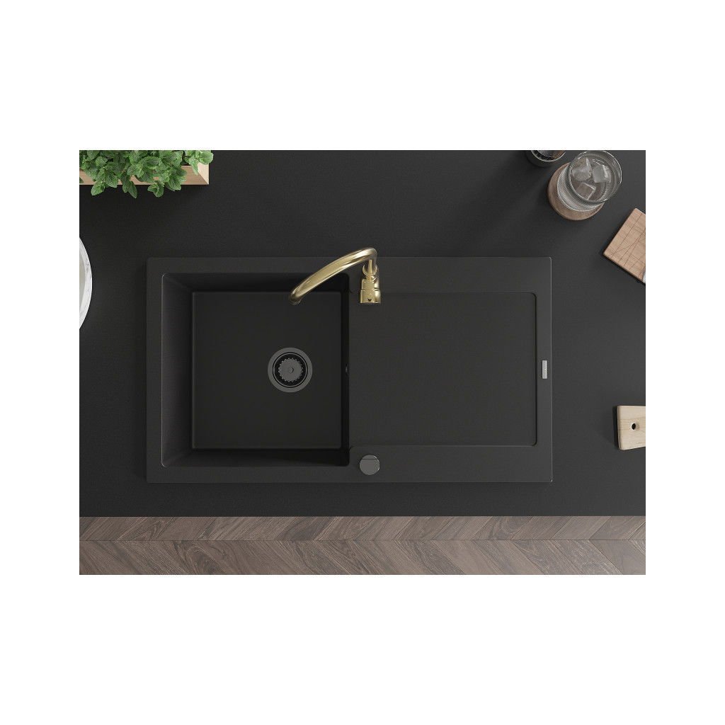Mexen Leo 1-komorový granitový dřez s odkapávačem 900x500mm a kuchyňskou baterií Telma, černá-zlatá, 6501-77-670200-50
