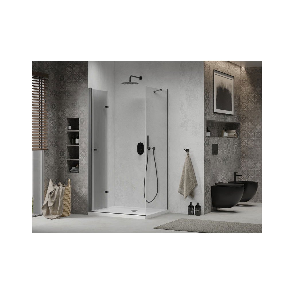 Mexen Lima, sprchový kout se skládacími dveřmi 80 (dveře) x 90 (stěna) cm, 6mm čiré sklo, černý profil + slim sprchová vanička bílá s černým sifonem, 856-080-090-70-00-4010B
