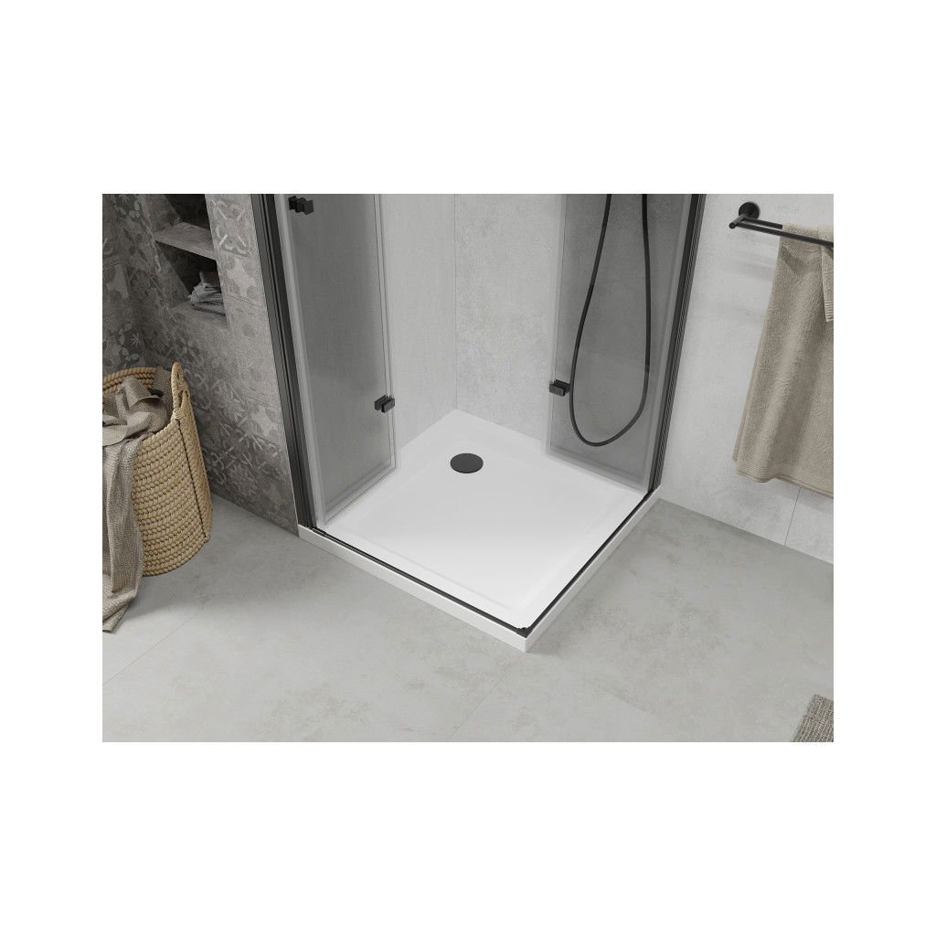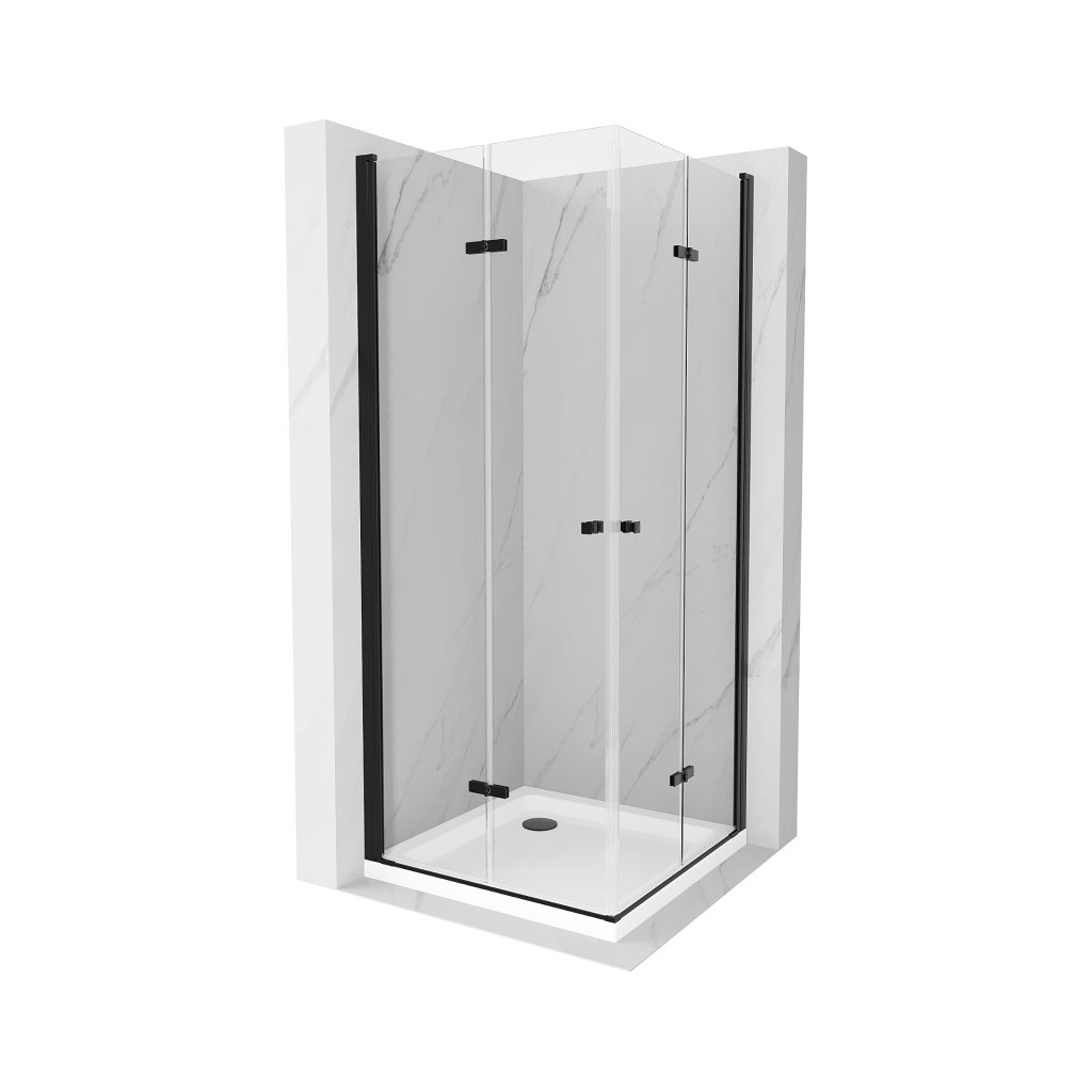 Mexen Lima Duo, sprchový kout s 2-křídlými skládacími dveřmi 80 (dveře) x 80 (dveře) cm, 6mm čiré sklo, černý profil + slim sprchová vanička 5cm bílá s černým sifonem, 856-080-080-70-02