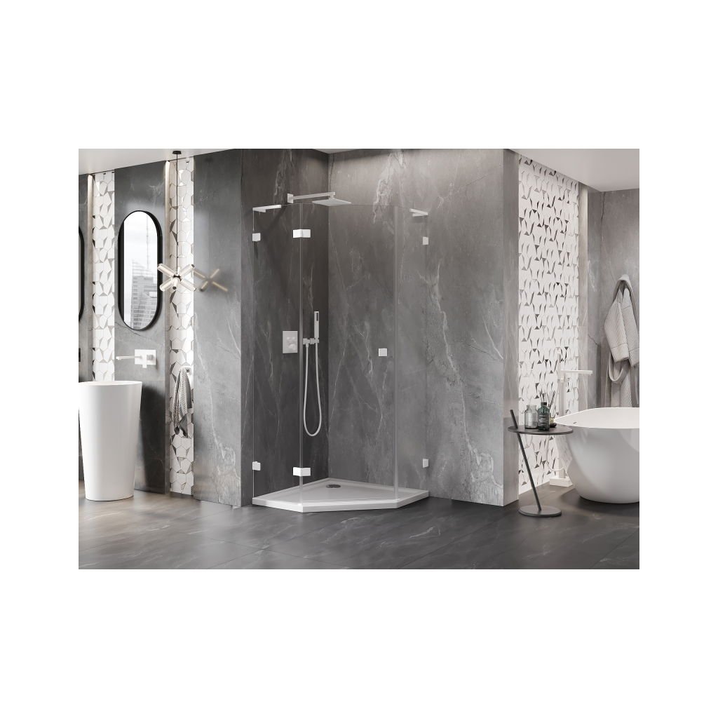 Mexen Lunar, L pětiúhelníkový sprchový kout naklápěcí doleva 100 x 100 cm, 8mm čiré sklo, bílý profil, 831L-100L-100P-20-00-L