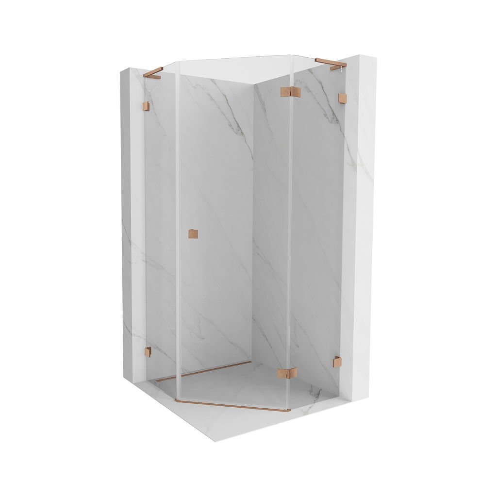 Mexen Lunar, L výklopný pětiúhelníkový sprchový kout pravý 90 x 90 cm, 8mm čiré sklo, profil měděná matná, 831L-090P-090L-65-00-P