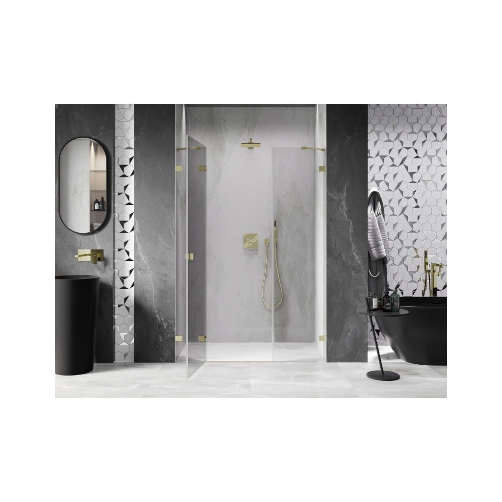 V konfiguraci více rozměrů nabízí stabilní konstrukci a výklopné (křídlové) dveře. Tvrzené sklo s povrchem EasyClean usnadňuje údržbu a profil v odstínu Broušená zlatá zapadne do moderních koupelen.