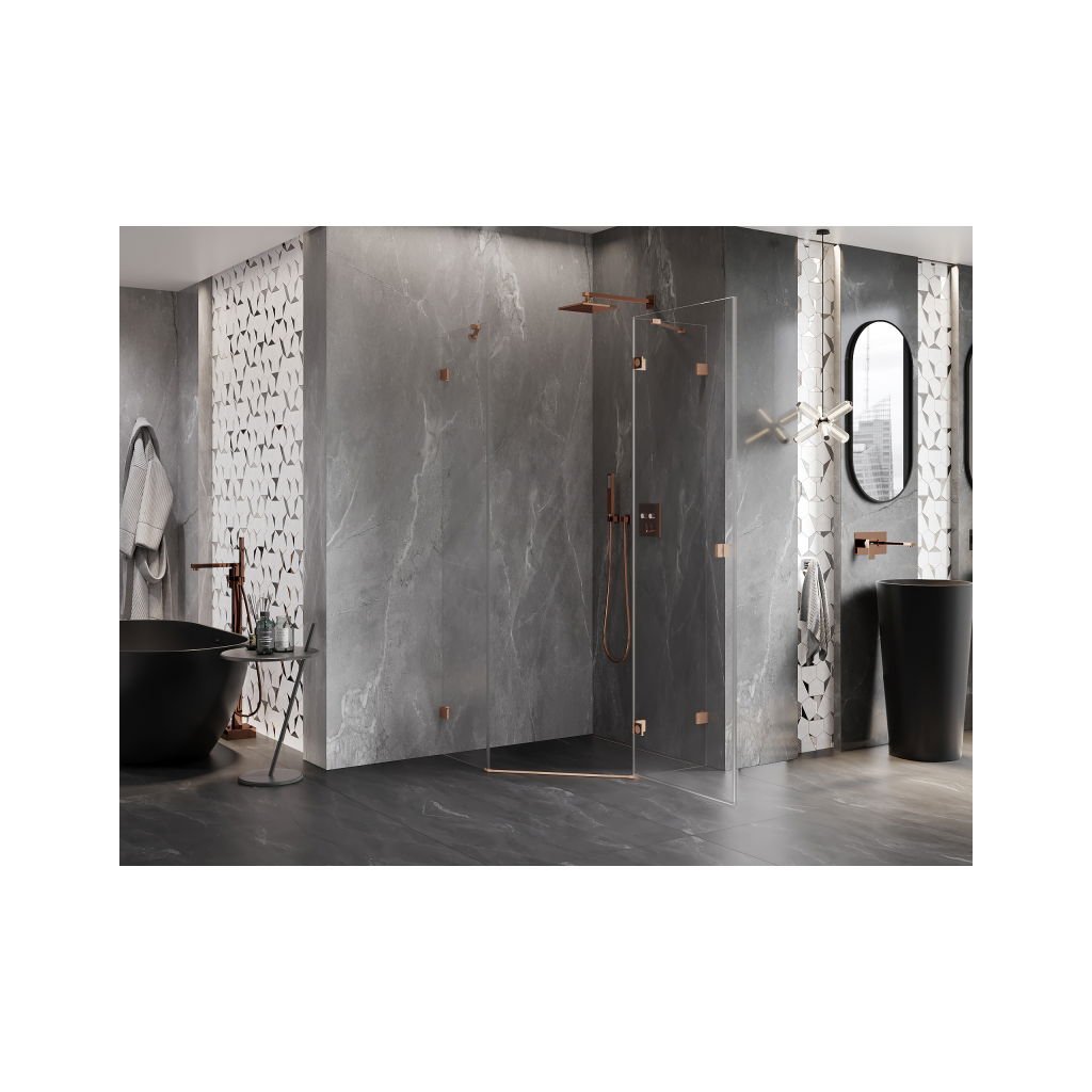 Mexen Lunar, pětiúhelníkový sprchový kout s pravým sklonem 80 x 80 cm, 8mm čiré sklo, profil měděná matná, 831-080P-080L-65-00-P