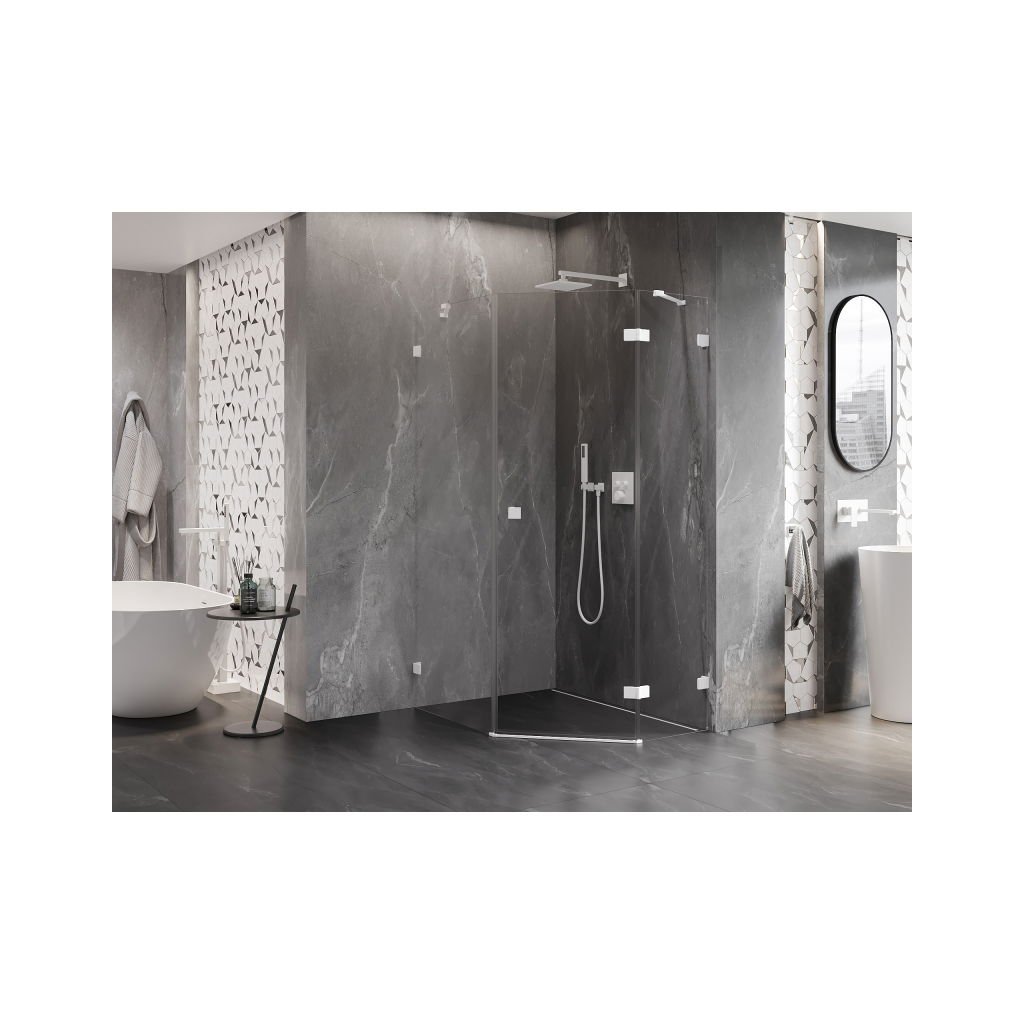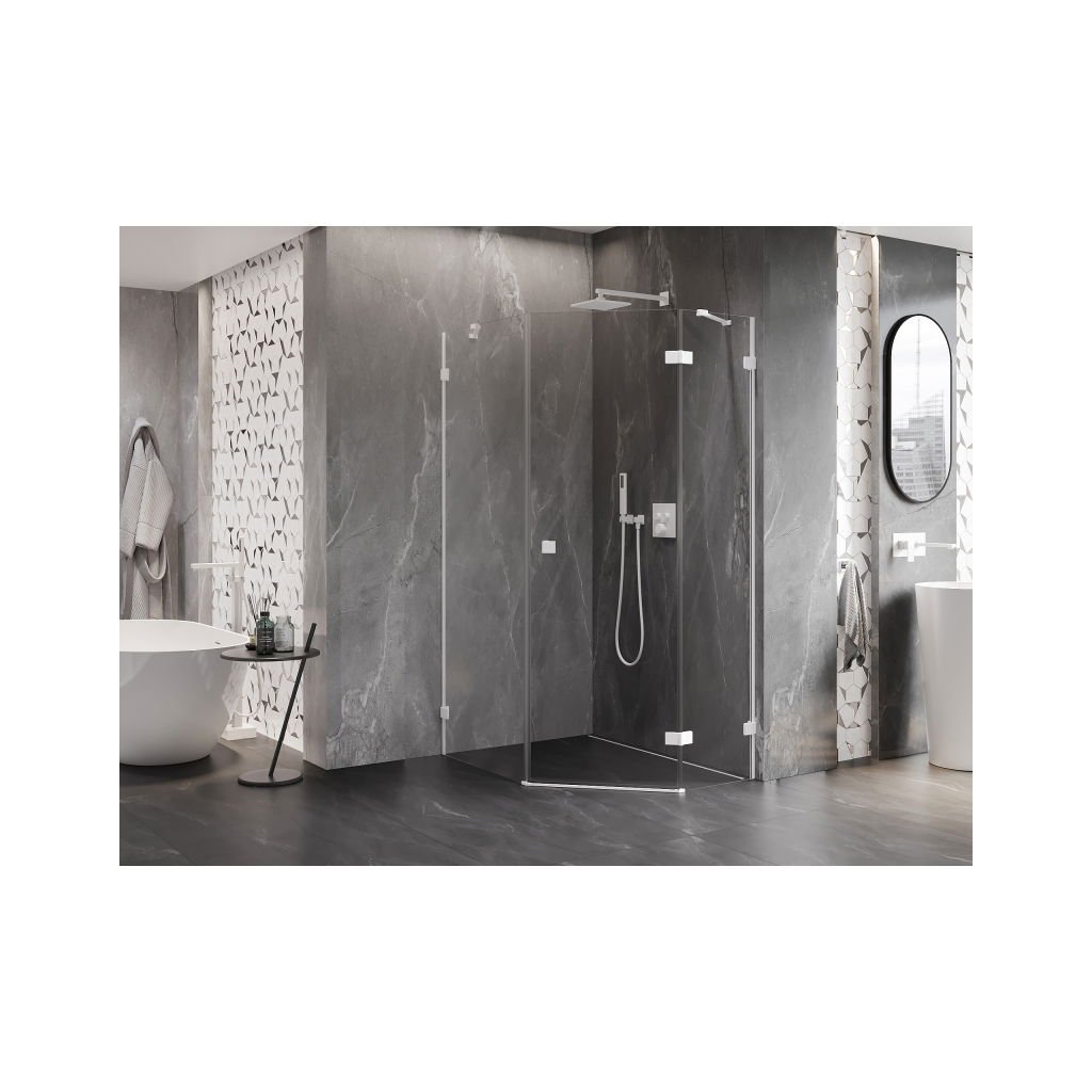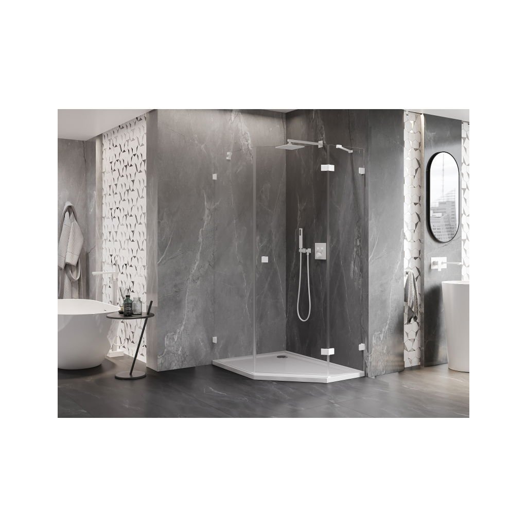 Mexen Lunar, pětiúhelníkový sprchový kout s pravým sklonem 80 x 90 cm, 8mm čiré sklo, bílý profil, 831-080P-090L-20-00-P