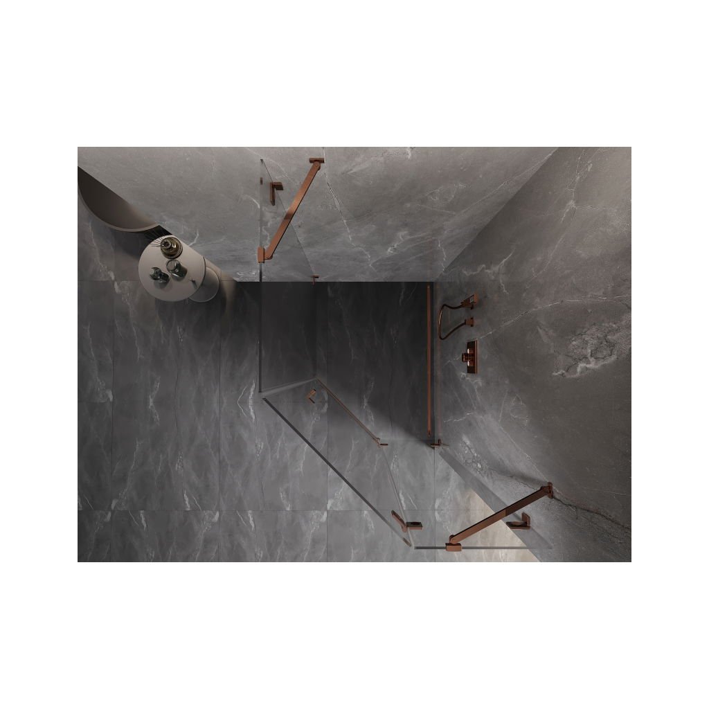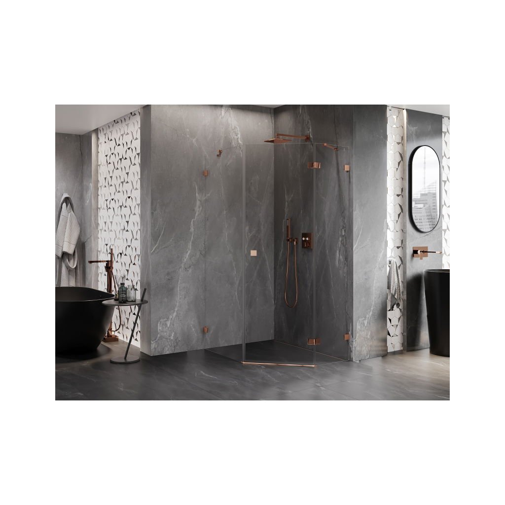 Mexen Lunar, pravý výklopný pětiúhelníkový sprchový kout 80 x 90 cm, 8mm čiré sklo, profil růžové zlato, 831-080P-090L-60-00-P