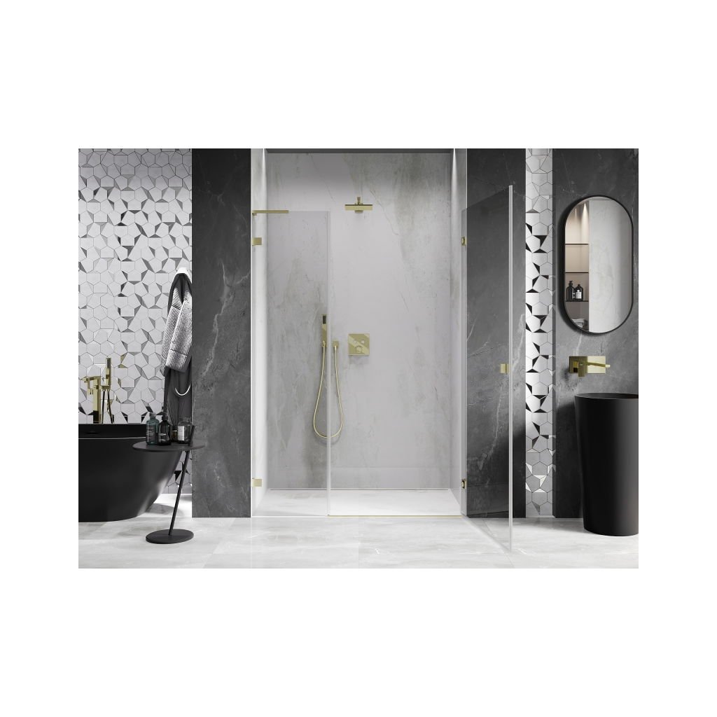 V konfiguraci více rozměrů nabízí stabilní konstrukci a výklopné (křídlové) dveře. Tvrzené sklo s povrchem EasyClean usnadňuje údržbu a profil v odstínu Broušená zlatá zapadne do moderních koupelen.