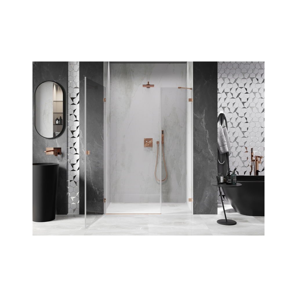 V konfiguraci více rozměrů nabízí stabilní konstrukci a výklopné (křídlové) dveře. Tvrzené sklo s povrchem EasyClean usnadňuje údržbu a profil v odstínu Broušená měď zapadne do moderních koupelen.