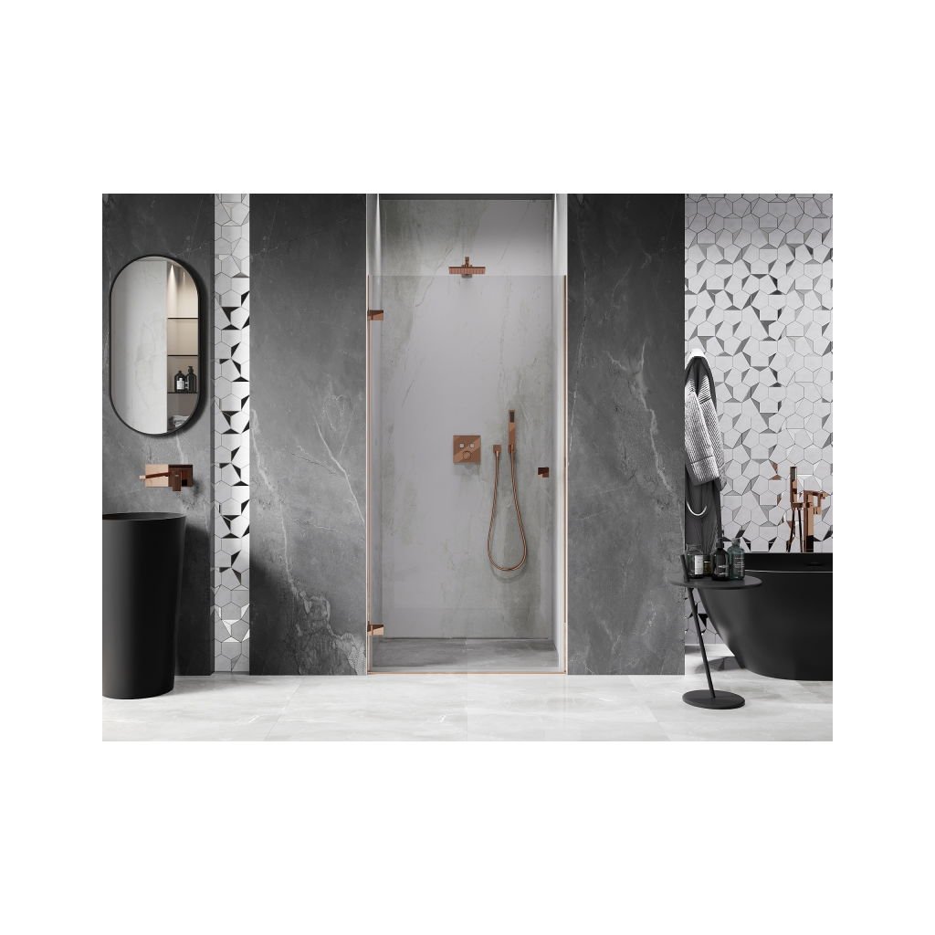 V konfiguraci více rozměrů nabízí stabilní konstrukci a výklopné (křídlové) dveře. Tvrzené sklo s povrchem EasyClean usnadňuje údržbu a profil v odstínu Růžové zlato zapadne do moderních koupelen.