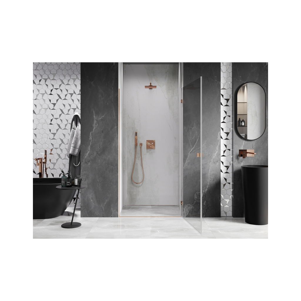 V konfiguraci více rozměrů nabízí stabilní konstrukci a výklopné (křídlové) dveře. Tvrzené sklo s povrchem EasyClean usnadňuje údržbu a profil v odstínu Broušená měď zapadne do moderních koupelen.